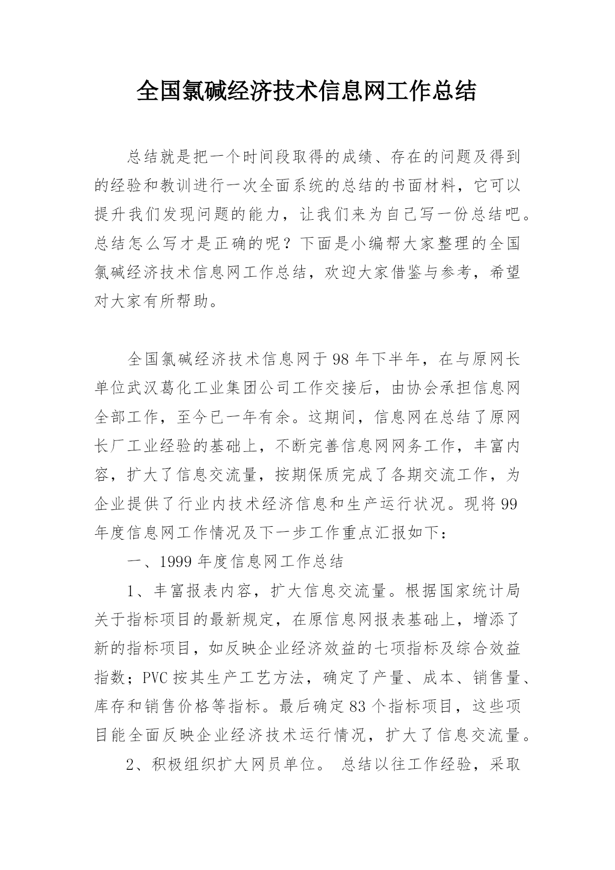 全国氯碱经济技术信息网工作总结总结就是把一个时间段取得的成绩、存在的问题及得到的经验和教训进行一次全面系统的总结的书面材料,它可以提升我们发现问题的能力,让我们来为自己写一份总结吧。总结怎么写才是正确的呢?下面是小编帮大家整理的全国氯碱经济技术信息网工作总结,欢迎大家借鉴与参考,希望对大家有所帮助。全国氯碱经济技术信息网于98年下半年,在与原网长单位武汉葛化工业集团公司工作交接后,由协会承担信息网全部工作,至今已一年有余。这期间,信息网在总结了原网长厂工业经验的基础上,不断完善信息网网务工作,丰富内容,扩