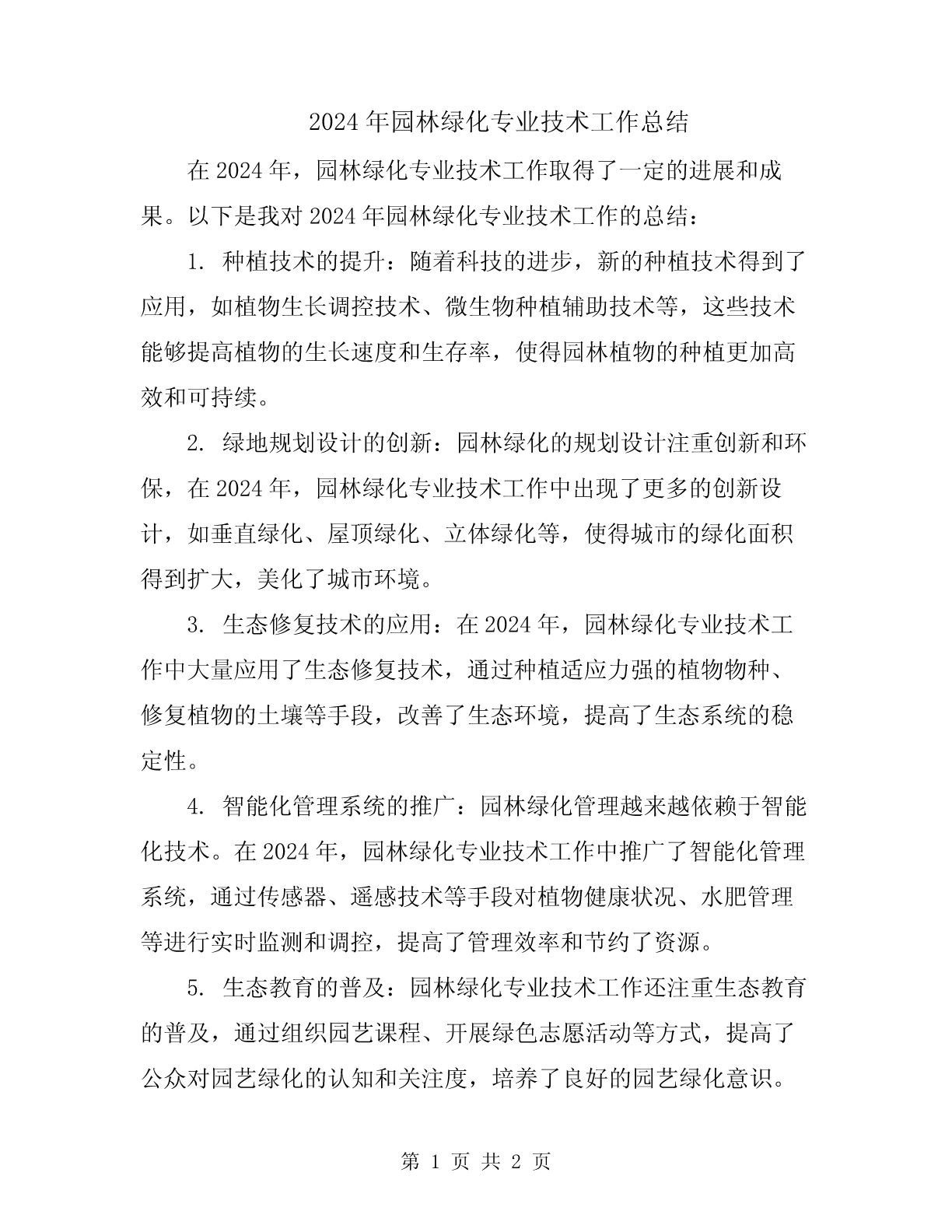 2024年园林绿化专业技术工作总结在2024年,园林绿化专业技术工作取得了一定的进展和成果。以下是我对2024年园林绿化专业技术工作的总结:1.种植技术的提升:随着科技的进步,新的种植技术得到了应用,如植物生长调控技术、微生物种植辅助技术等,这些技术能够提高植物的生长速度和生存率,使得园林植物的种植更加高效和可持续。2.绿地规划设计的创新:园林绿化的规划设计注重创新和环保,在2024年,园林绿化专业技术工作中出现了更多的创新设计,如垂直绿化、屋顶绿化、立体绿化等,使得城市的绿化面积得到扩大,美化了城市环境