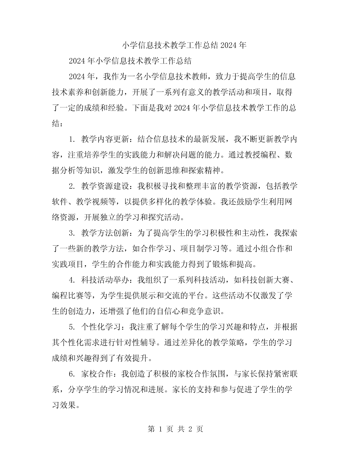 小学信息技术教学工作总结2024年2024年小学信息技术教学工作总结2024年,我作为一名小学信息技术教师,致力于提高学生的信息技术素养和创新能力,开展了一系列有意义的教学活动和项目,取得了一定的成绩和经验。下面是我对2024年小学信息技术教学工作的总结:1.教学内容更新:结合信息技术的最新发展,我不断更新教学内容,注重培养学生的实践能力和解决问题的能力。通过教授编程、数据分析等知识,激发学生的创新思维和探索精神。2.教学资源建设:我积极寻找和整理丰富的教学资源,包括教学软件、教学视频等,以提供多样化的教