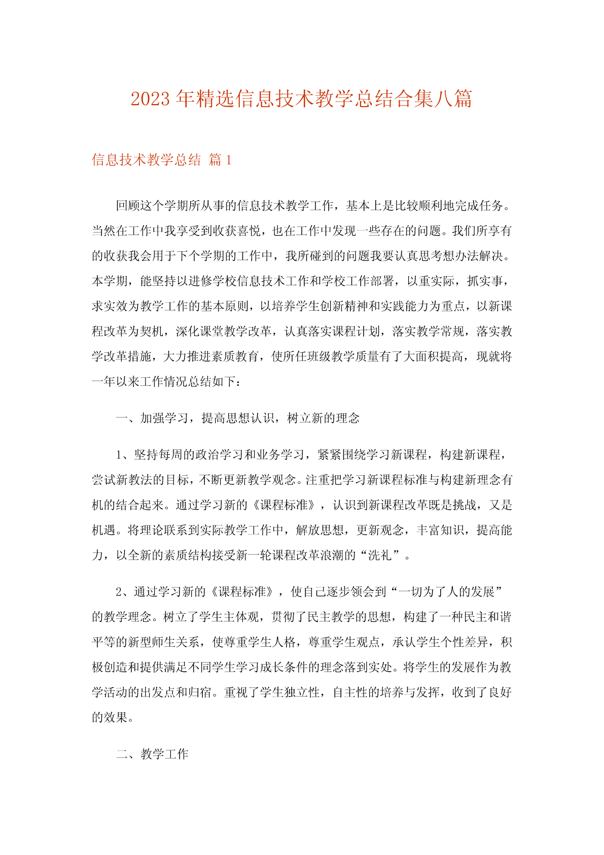 2023年精选信息技术教学总结合集八篇信息技术教学总结篇1回顾这个学期所从事的信息技术教学工作,基本上是比较顺利地完成任务。当然在工作中我享受到收获喜悦,也在工作中发现一些存在的问题。我们所享有的收获我会用于下个学期的工作中,我所碰到的问题我要认真思考想办法解决。本学期,能坚持以进修学校信息技术工作和学校工作部署,以重实际,抓实事,求实效为教学工作的基本原则,以培养学生创新精神和实践能力为重点,以新课程改革为契机,深化课堂教学改革,认真落实课程计划,落实教学常规,落实教学改革措施,大力推进素质教育,使所任