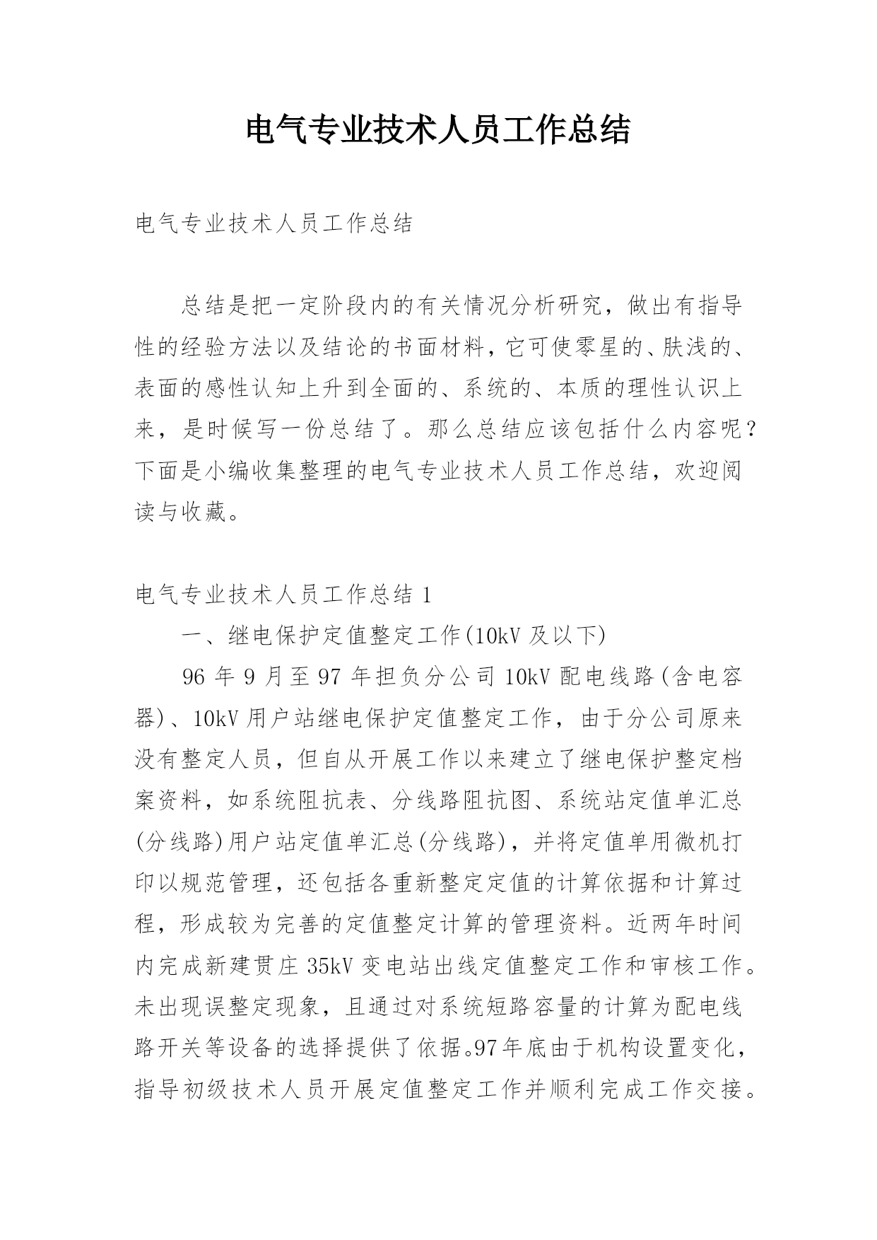 电气专业技术人员工作总结电气专业技术人员工作总结总结是把一定阶段内的有关情况分析研究,做出有指导性的经验方法以及结论的书面材料,它可使零星的、肤浅的、表面的感性认知上升到全面的、系统的、本质的理性认识上来,是时候写一份总结了。那么总结应该包括什么内容呢?下面是小编收集整理的电气专业技术人员工作总结,欢迎阅读与收藏。电气专业技术人员工作总结1一、继电保护定值整定工作(10kV及以下)96年9月至97年担负分公司10kV配电线路(含电容器)、10kV用户站继电保护定值整定工作,由于分公司原来没有整定人员,但自