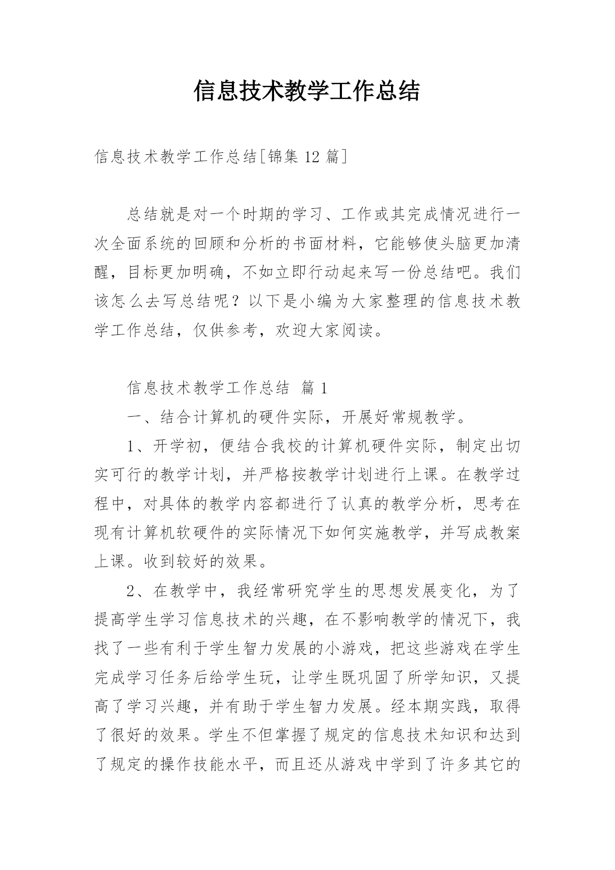 信息技术教学工作总结信息技术教学工作总结[锦集12篇]总结就是对一个时期的学习、工作或其完成情况进行一次全面系统的回顾和分析的书面材料,它能够使头脑更加清醒,目标更加明确,不如立即行动起来写一份总结吧。我们该怎么去写总结呢?以下是小编为大家整理的信息技术教学工作总结,仅供参考,欢迎大家阅读。信息技术教学工作总结篇1一、结合计算机的硬件实际,开展好常规教学。1、开学初,便结合我校的计算机硬件实际,制定出切实可行的教学计划,并严格按教学计划进行上课。在教学过程中,对具体的教学内容都进行了认真的教学分析,思考在