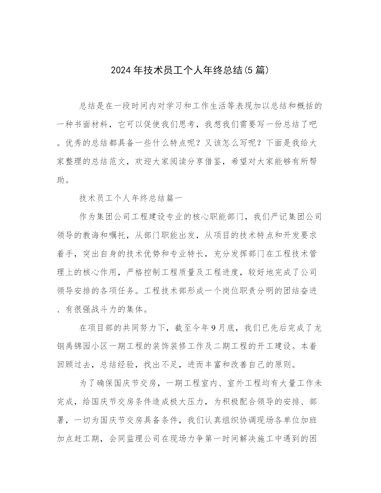 2024年技术员工个人年终总结(5篇)总结是在一段时间内对学习和工作生活等表现加以总结和概括的一种书面材料,它可以促使我们思考,我想我们需要写一份总结了吧。优秀的总结都具备一些什么特点呢?又该怎么写呢?下面是我给大家整理的总结范文,欢迎大家阅读分享借鉴,希望对大家能够有所帮助。技术员工个人年终总结篇一作为集团公司工程建设专业的核心职能部门,我们严记集团公司领导的教诲和嘱托,从部门职能出发,从项目的技术特点和开发要求着手,突出自身的技术优势和专业特长,充分发挥部门在工程技术管理上的核心作用,严格控制工程质量