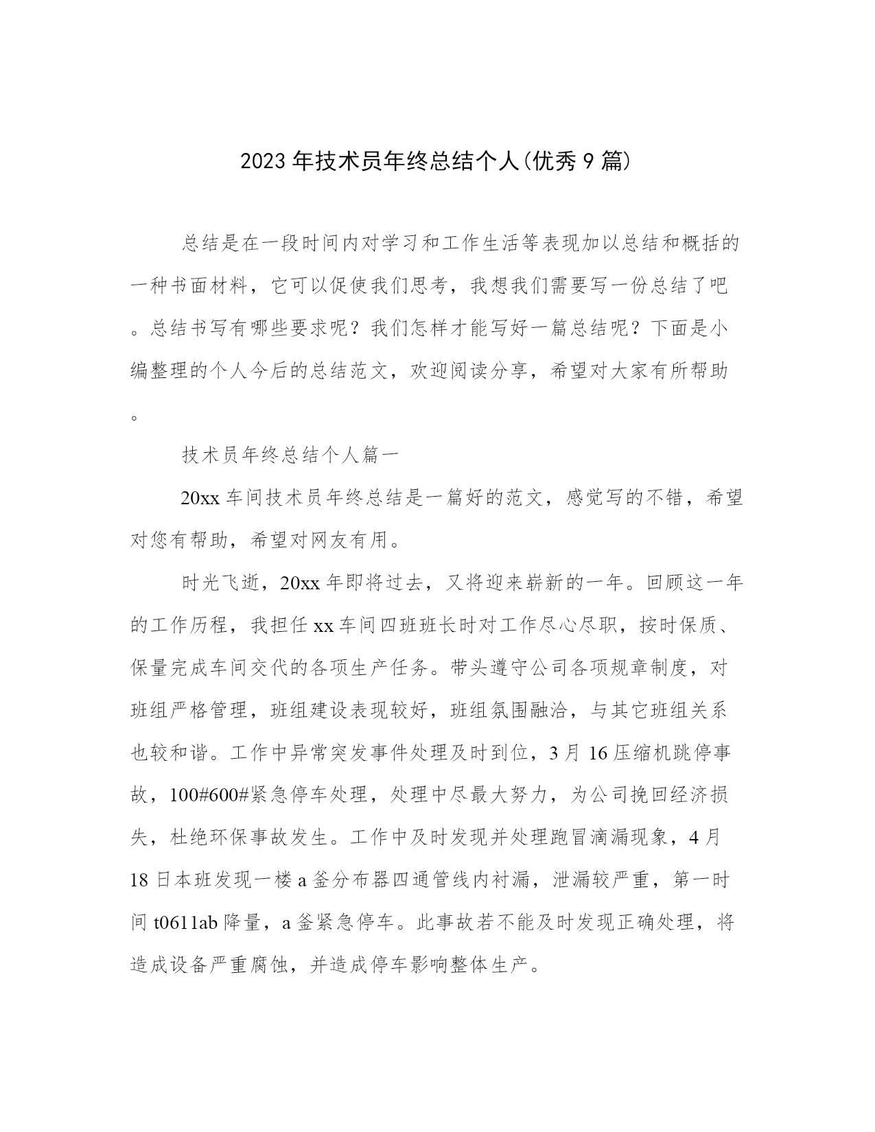 2023年技术员年终总结个人(优秀9篇)总结是在一段时间内对学习和工作生活等表现加以总结和概括的一种书面材料,它可以促使我们思考,我想我们需要写一份总结了吧。总结书写有哪些要求呢?我们怎样才能写好一篇总结呢?下面是小编整理的个人今后的总结范文,欢迎阅读分享,希望对大家有所帮助。技术员年终总结个人篇一20xx车间技术员年终总结是一篇好的范文,感觉写的不错,希望对您有帮助,希望对网友有用。时光飞逝,20xx年即将过去,又将迎来崭新的一年。回顾这一年的工作历程,我担任xx车间四班班长时对工作尽心尽职,按时保质、