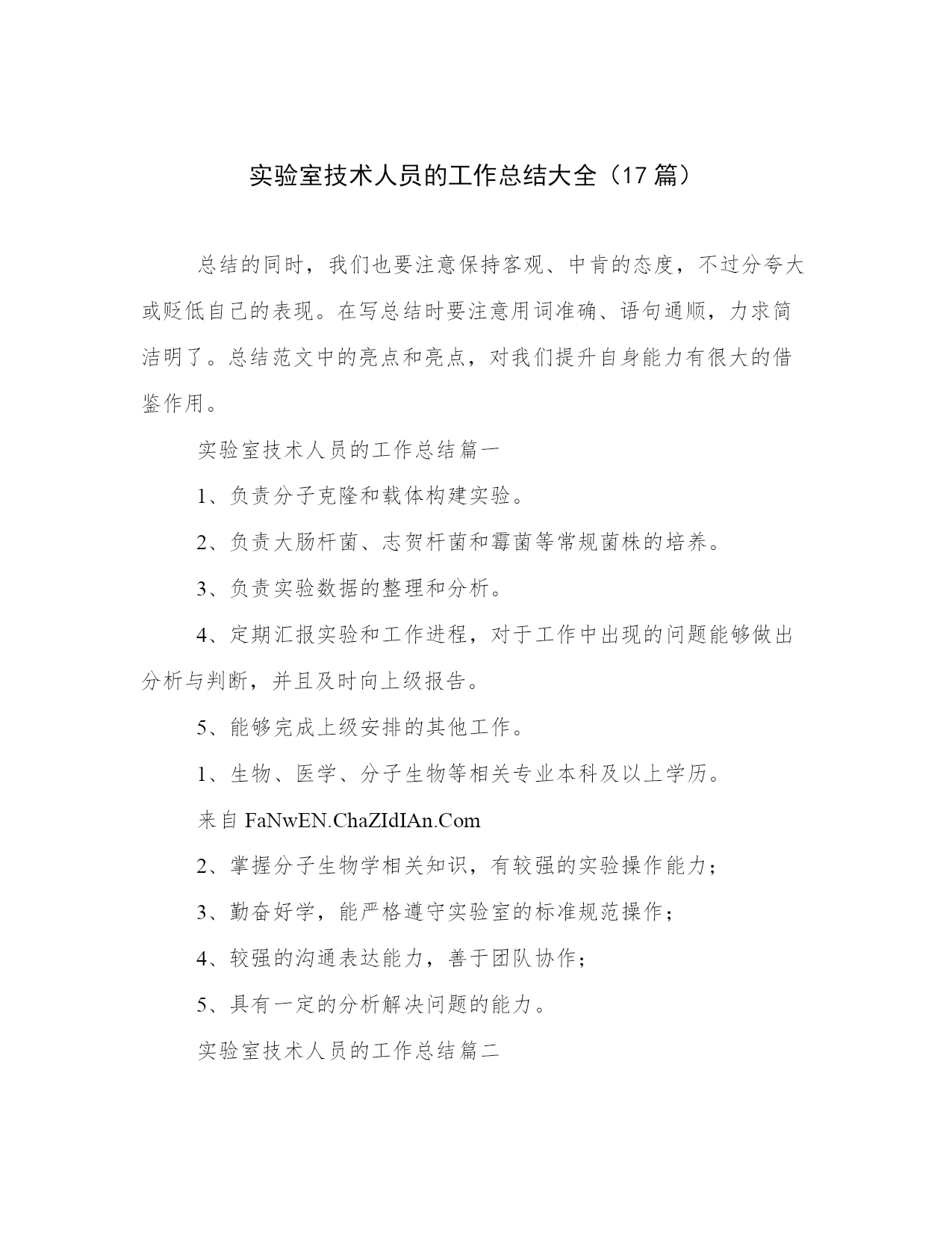 实验室技术人员的工作总结大全(17篇)总结的同时,我们也要注意保持客观、中肯的态度,不过分夸大或贬低自己的表现。在写总结时要注意用词准确、语句通顺,力求简洁明了。总结范文中的亮点和亮点,对我们提升自身能力有很大的借鉴作用。实验室技术人员的工作总结篇一1、负责分子克隆和载体构建实验。2、负责大肠杆菌、志贺杆菌和霉菌等常规菌株的培养。3、负责实验数据的整理和分析。4、定期汇报实验和工作进程,对于工作中出现的问题能够做出分析与判断,并且及时向上级报告。5、能够完成上级安排的其他工作。1、生物、医学、分子生物等相
