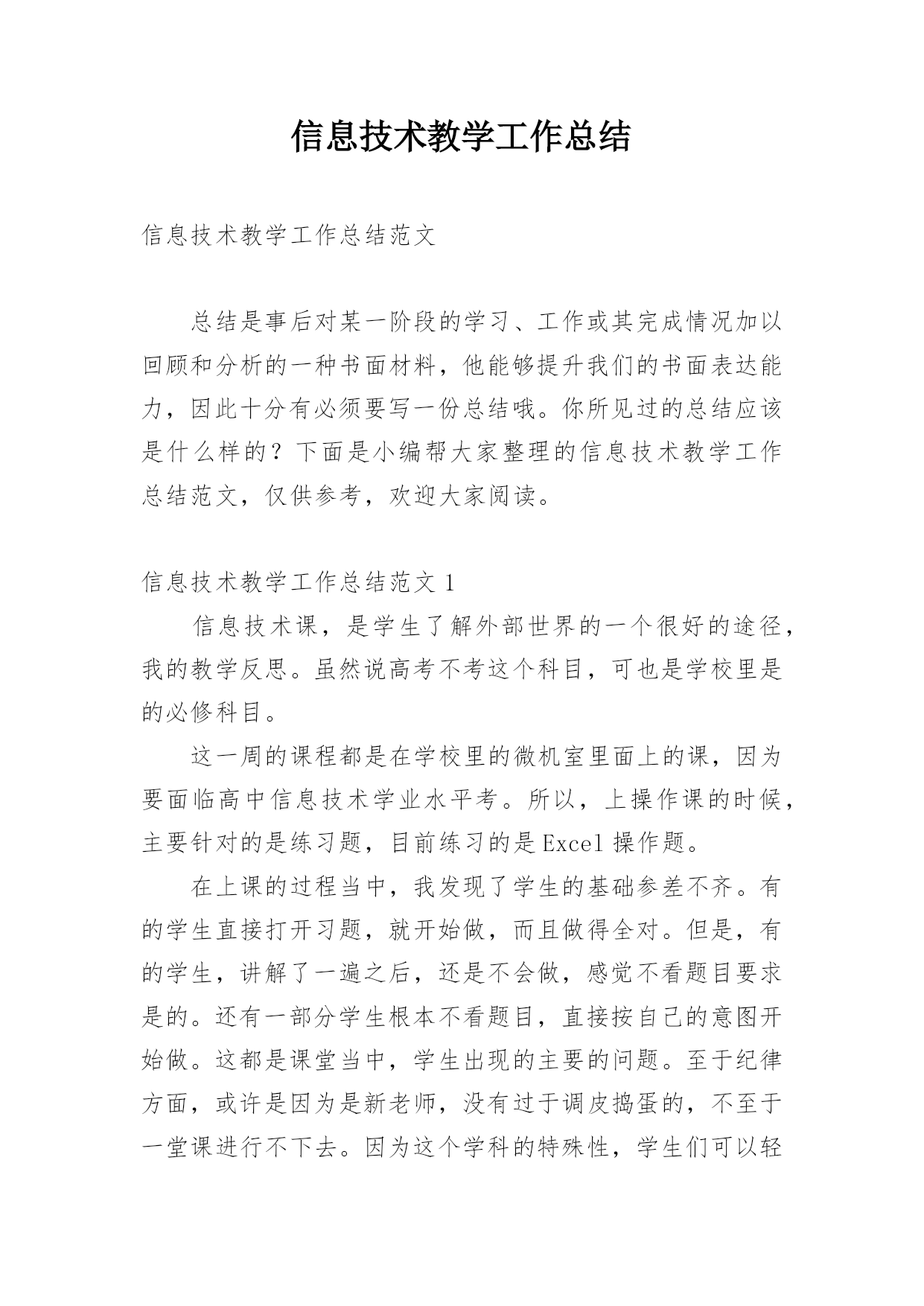信息技术教学工作总结信息技术教学工作总结范文总结是事后对某一阶段的学习、工作或其完成情况加以回顾和分析的一种书面材料,他能够提升我们的书面表达能力,因此十分有必须要写一份总结哦。你所见过的总结应该是什么样的?下面是小编帮大家整理的信息技术教学工作总结范文,仅供参考,欢迎大家阅读。信息技术教学工作总结范文1信息技术课,是学生了解外部世界的一个很好的途径,我的教学反思。虽然说高考不考这个科目,可也是学校里是的必修科目。这一周的课程都是在学校里的微机室里面上的课,因为要面临高中信息技术学业水平考。所以,上操作课