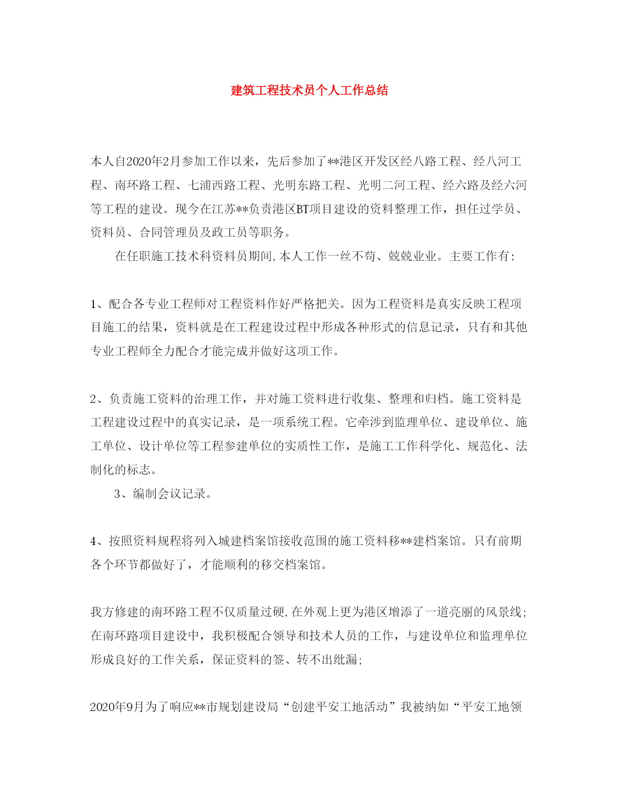 此资料由网络收集而来,如有侵权请告知上传者立即删除。资料共分享,我们负责传递知识。建筑工程技术员个人工作总结本人自2020年2月参加工作以来,先后参加了**港区开发区经八路工程、经八河工程、南环路工程、七浦西路工程、光明东路工程、光明二河工程、经六路及经六河等工程的建设。现今在江苏**负责港区BT项目建设的资料整理工作,担任过学员、资料员、合同管理员及政工员等职务。在任职施工技术科资料员期间,本人工作一丝不苟、兢兢业业。主要工作有:1、配合各专业工程师对工程资料作好严格把关。因为工程资料是真实反映工程项目