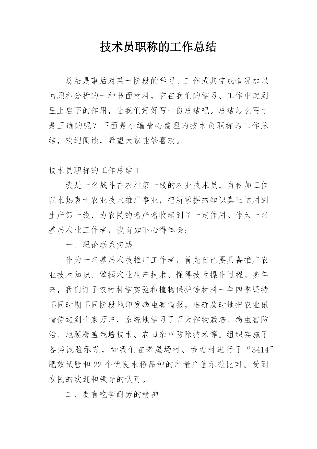 技术员职称的工作总结总结是事后对某一阶段的学习、工作或其完成情况加以回顾和分析的一种书面材料,它在我们的学习、工作中起到呈上启下的作用,让我们好好写一份总结吧。总结怎么写才是正确的呢?下面是小编精心整理的技术员职称的工作总结,欢迎阅读,希望大家能够喜欢。技术员职称的工作总结1我是一名战斗在农村第一线的农业技术员,自参加工作以来热衷于农业技术推广事业,把所掌握的知识真正运用到生产第一线,为农民的增产增收起到了一定作用。作为一名基层农业工作者,我有如下心得体会:一、理论联系实践作为一名基层农技推广工作者,首先