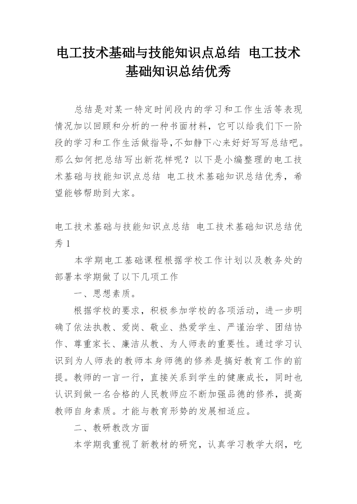 电工技术基础与技能知识点总结电工技术基础知识总结优秀总结是对某一特定时间段内的学习和工作生活等表现情况加以回顾和分析的一种书面材料,它可以给我们下一阶段的学习和工作生活做指导,不如静下心来好好写写总结吧。那么如何把总结写出新花样呢?以下是小编整理的电工技术基础与技能知识点总结电工技术基础知识总结优秀,希望能够帮助到大家。电工技术基础与技能知识点总结电工技术基础知识总结优秀1本学期电工基础课程根据学校工作计划以及教务处的部署本学期做了以下几项工作一、思想素质。根据学校的要求,积极参加学校的各项活动,进一步明