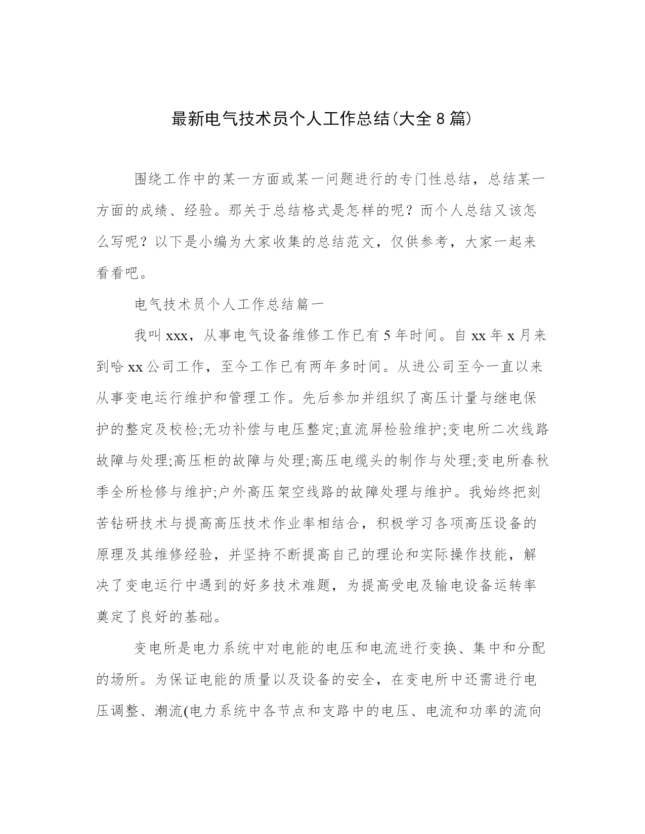 最新电气技术员个人工作总结(大全8篇)围绕工作中的某一方面或某一问题进行的专门性总结,总结某一方面的成绩、经验。那关于总结格式是怎样的呢?而个人总结又该怎么写呢?以下是小编为大家收集的总结范文,仅供参考,大家一起来看看吧。电气技术员个人工作总结篇一我叫xxx,从事电气设备维修工作已有5年时间。自xx年x月来到哈xx公司工作,至今工作已有两年多时间。从进公司至今一直以来从事变电运行维护和管理工作。先后参加并组织了高压计量与继电保护的整定及校检;无功补偿与电压整定;直流屏检验维护;变电所二次线路故障与处理;高