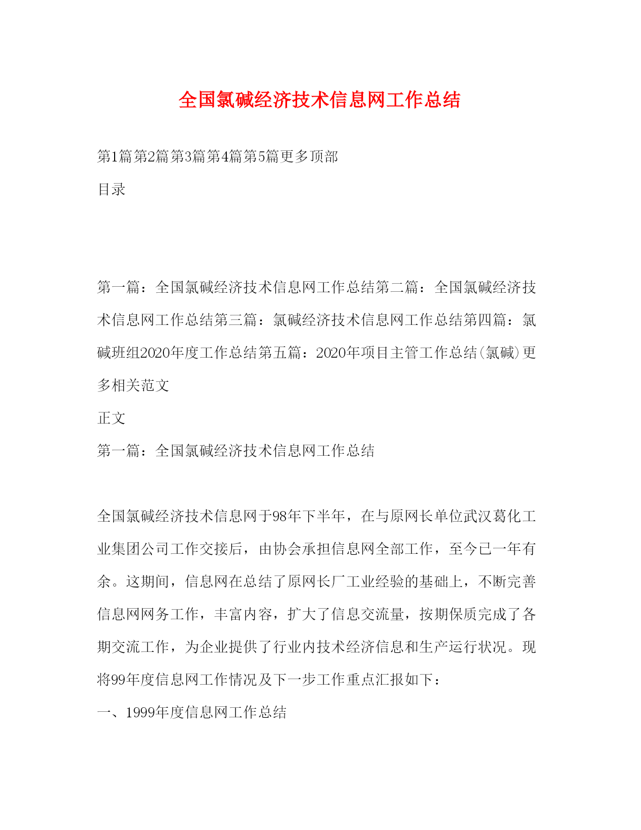 PAGE此资料由网络收集而来,如有侵权请告知上传者立即删除。资料共分享,我们负责传递知识。全国氯碱经济技术信息网工作总结第1篇第2篇第3篇第4篇第5篇更多顶部目录第一篇:全国氯碱经济技术信息网工作总结第二篇:全国氯碱经济技术信息网工作总结第三篇:氯碱经济技术信息网工作总结第四篇:氯碱班组2020年度工作总结第五篇:2020年项目主管工作总结(氯碱)更多相关范文正文第一篇:全国氯碱经济技术信息网工作总结全国氯碱经济技术信息网于98年下半年,在与原网长单位武汉葛化工业集团公司工作交接后,由协会承担信息网