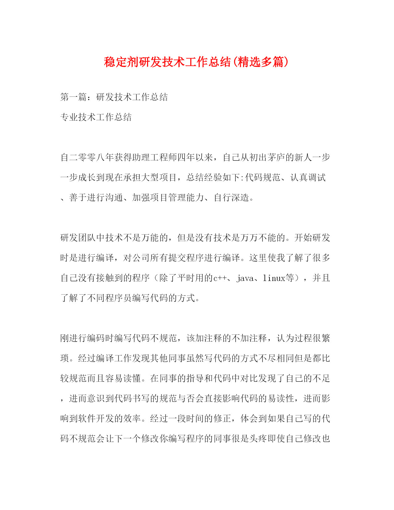 PAGE此资料由网络收集而来,如有侵权请告知上传者立即删除。资料共分享,我们负责传递知识。稳定剂研发技术工作总结(精选多篇)第一篇:研发技术工作总结专业技术工作总结自二零零八年获得助理工程师四年以来,自己从初出茅庐的新人一步一步成长到现在承担大型项目,总结经验如下:代码规范、认真调试、善于进行沟通、加强项目管理能力、自行深造。研发团队中技术不是万能的,但是没有技术是万万不能的。开始研发时是进行编译,对公司所有提交程序进行编译。这里使我了解了很多自己没有接触到的程序(除了平时用的c++、java、li