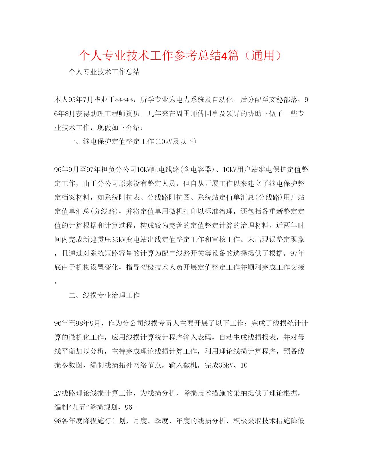 个人专业技术工作参考总结4篇(通用)个人专业技术工作总结本人95年7月毕业于*****,所学专业为电力系统及自动化。后分配至文秘部落,96年8月获得助理工程师资历。几年来在周围师傅同事及领导的协助下做了一些专业技术工作,现做如下介绍:一、继电保护定值整定工作(10kV及以下)96年9月至97年担负分公司10kV配电线路(含电容器)、10kV用户站继电保护定值整定工作,由于分公司原来没有整定人员,但自从开展工作以来建立了继电保护整定档案材料,如系统阻抗表、分线路阻抗图、系统站定值单汇总(分线路)用户站定值单