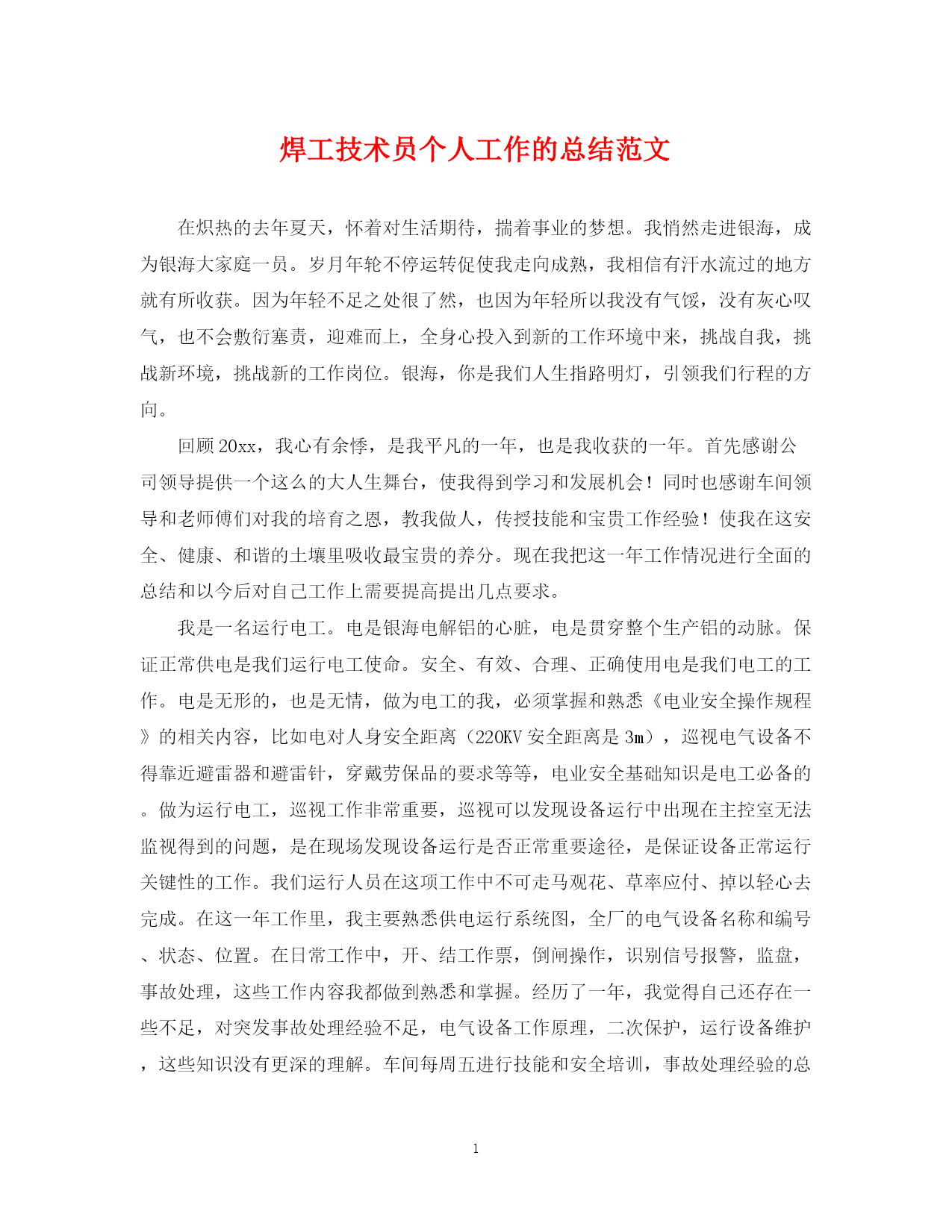 此资料由网络收集而来,如有侵权请告知上传者立即删除。资料共分享,我们负责传递知识。PAGEPAGE3焊工技术员个人工作的总结范文在炽热的去年夏天,怀着对生活期待,揣着事业的梦想。我悄然走进银海,成为银海大家庭一员。岁月年轮不停运转促使我走向成熟,我相信有汗水流过的地方就有所收获。因为年轻不足之处很了然,也因为年轻所以我没有气馁,没有灰心叹气,也不会敷衍塞责,迎难而上,全身心投入到新的工作环境中来,挑战自我,挑战新环境,挑战新的工作岗位。银海,你是我们人生指路明灯,引领我们行程的方向。回顾20x
