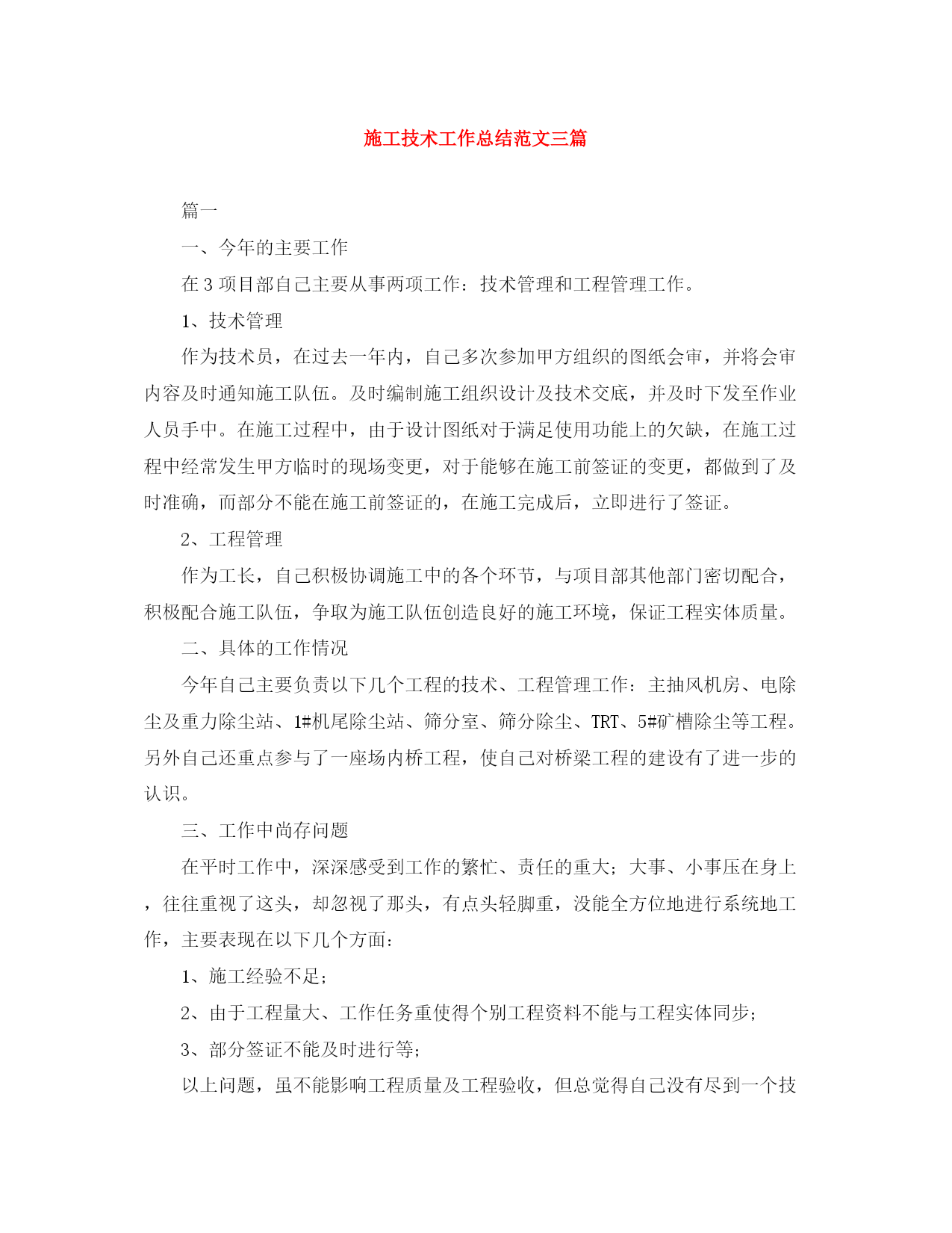 精编之施工技术工作总结范文三篇.docx