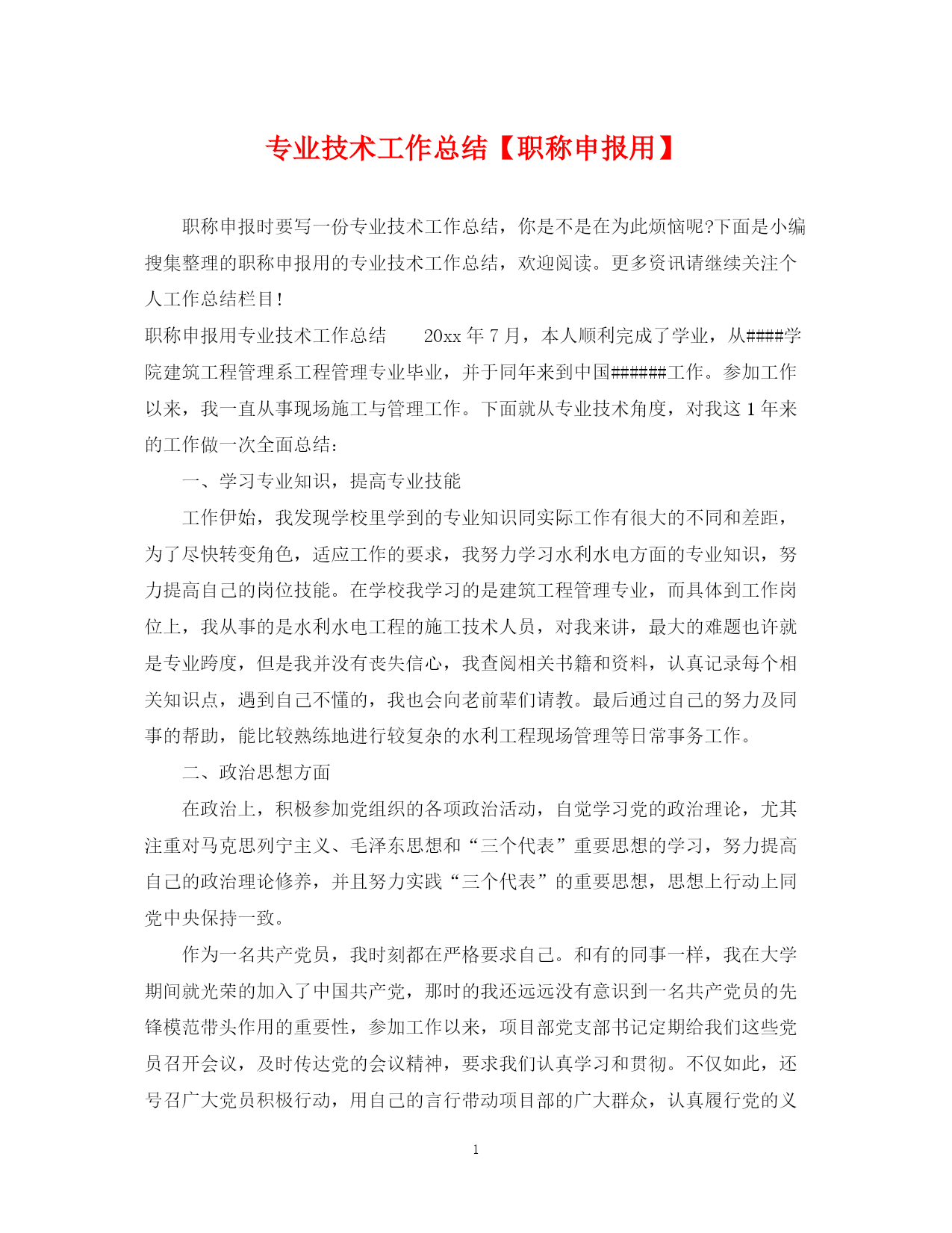 此资料由网络收集而来,如有侵权请告知上传者立即删除。资料共分享,我们负责传递知识。PAGEPAGE7专业技术工作总结【职称申报用】职称申报时要写一份专业技术工作总结,你是不是在为此烦恼呢?下面是小编搜集整理的职称申报用的专业技术工作总结,欢迎阅读。更多资讯请继续关注个人工作总结栏目!职称申报用专业技术工作总结20xx年7月,本人顺利完成了学业,从####学院建筑工程管理系工程管理专业毕业,并于同年来到中国######工作。参加工作以来,我一直从事现场施工与管理工作。下面就从专业技术角度,对我这