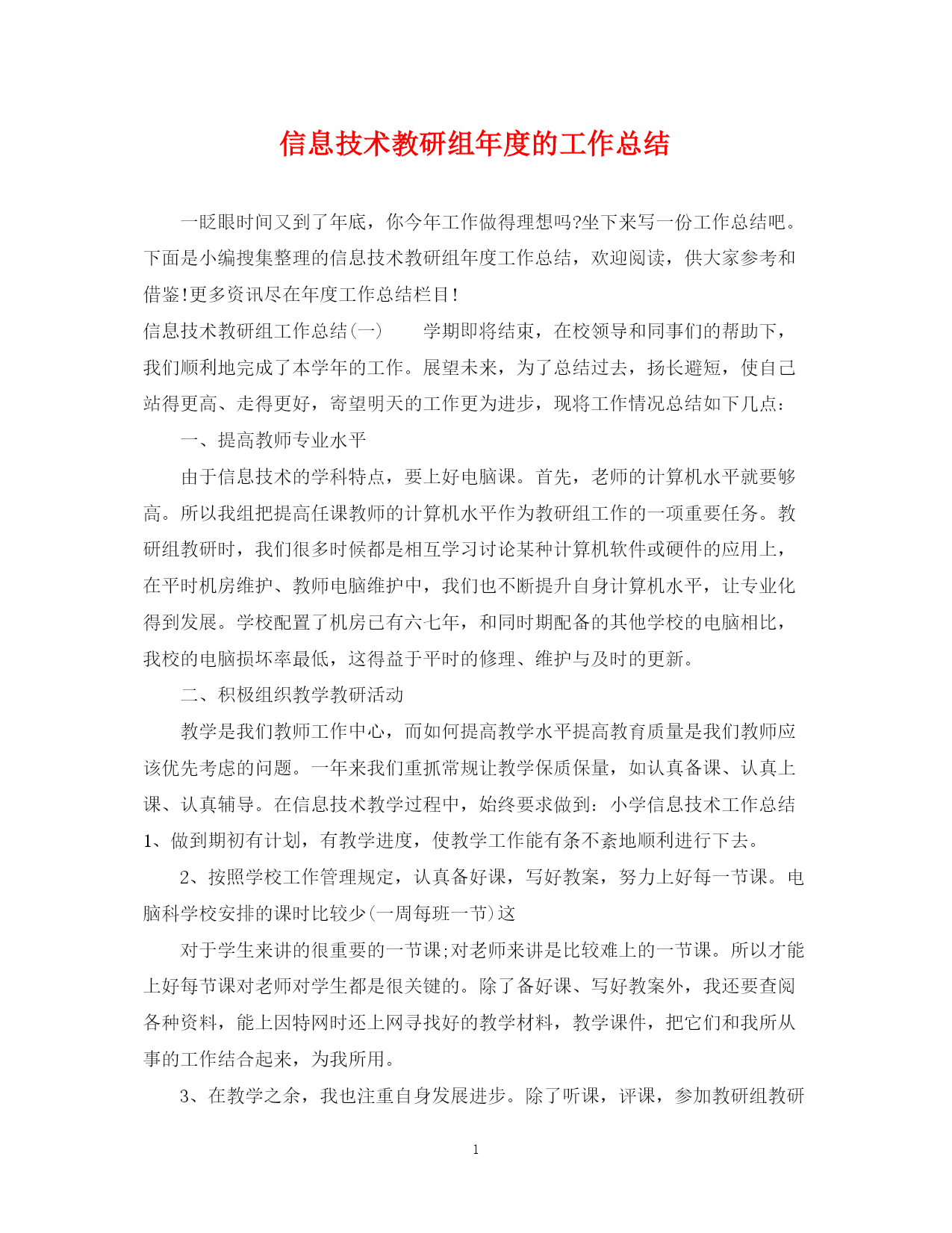 此资料由网络收集而来,如有侵权请告知上传者立即删除。资料共分享,我们负责传递知识。PAGEPAGE4信息技术教研组年度的工作总结一眨眼时间又到了年底,你今年工作做得理想吗?坐下来写一份工作总结吧。下面是小编搜集整理的信息技术教研组年度工作总结,欢迎阅读,供大家参考和借鉴!更多资讯尽在年度工作总结栏目!信息技术教研组工作总结(一)学期即将结束,在校领导和同事们的帮助下,我们顺利地完成了本学年的工作。展望未来,为了总结过去,扬长避短,使自己站得更高、走得更好,寄望明天的工作更为进步,现将工作情况总