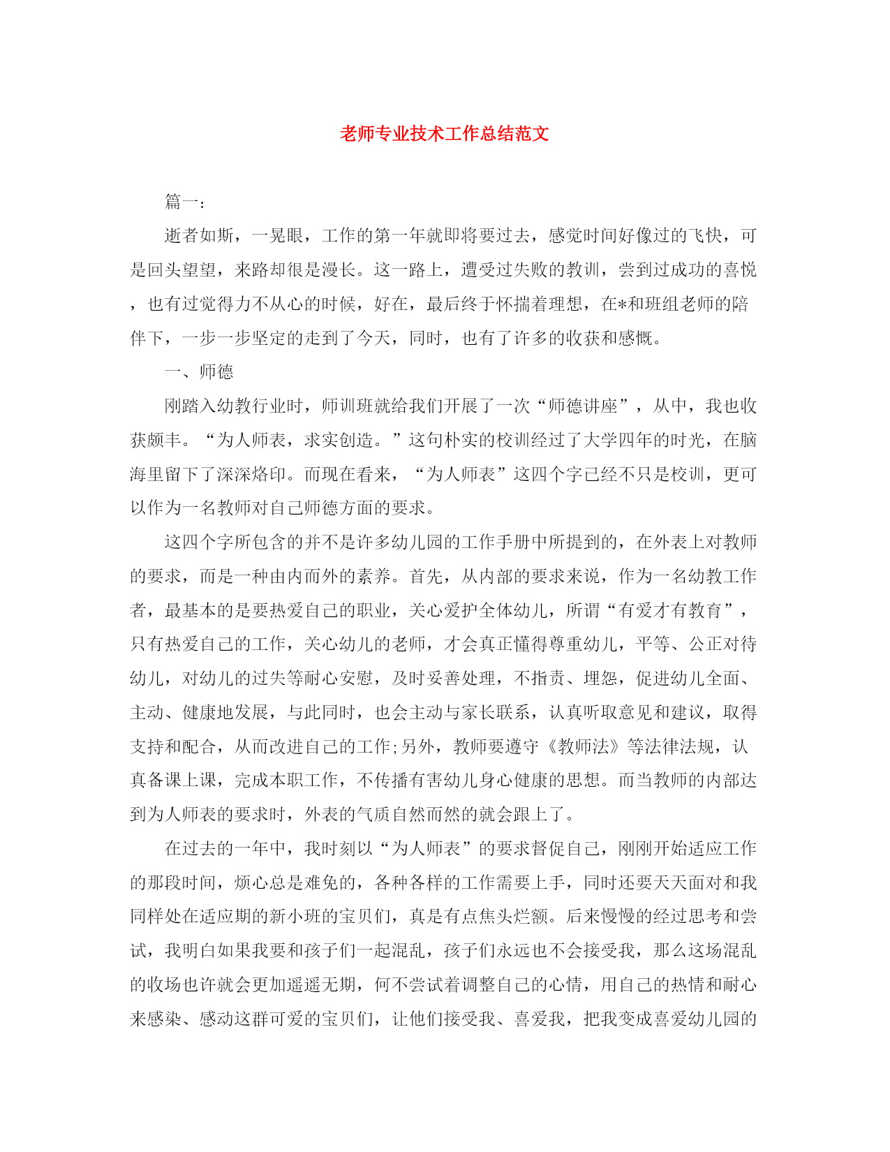 此资料由网络收集而来,如有侵权请告知上传者立即删除。资料共分享,我们负责传递知识。老师专业技术工作总结范文篇一:逝者如斯,一晃眼,工作的第一年就即将要过去,感觉时间好像过的飞快,可是回头望望,来路却很是漫长。这一路上,遭受过失败的教训,尝到过成功的喜悦,也有过觉得力不从心的时候,好在,最后终于怀揣着理想,在*和班组老师的陪伴下,一步一步坚定的走到了今天,同时,也有了许多的收获和感慨。一、师德刚踏入幼教行业时,师训班就给我们开展了一次“师德讲座”,从中,我也收获颇丰。“为人师表,求实创造。”这句朴实的校训经