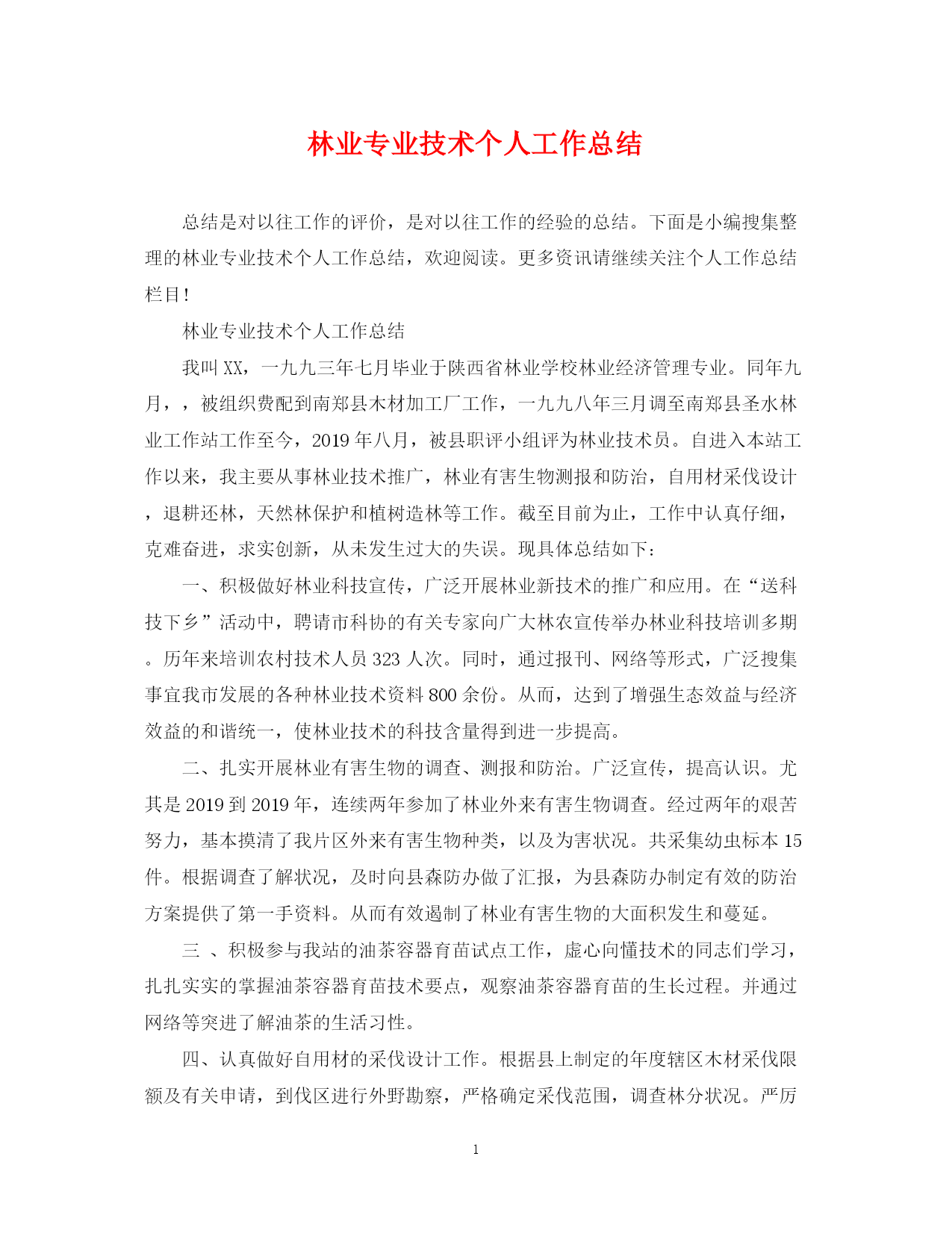 此资料由网络收集而来,如有侵权请告知上传者立即删除。资料共分享,我们负责传递知识。PAGEPAGE4林业专业技术个人工作总结总结是对以往工作的评价,是对以往工作的经验的总结。下面是小编搜集整理的林业专业技术个人工作总结,欢迎阅读。更多资讯请继续关注个人工作总结栏目!林业专业技术个人工作总结我叫XX,一九九三年七月毕业于陕西省林业学校林业经济管理专业。同年九月,,被组织费配到南郑县木材加工厂工作,一九九八年三月调至南郑县圣水林业工作站工作至今,2019年八月,被县职评小组评为林业技术员。自进入本