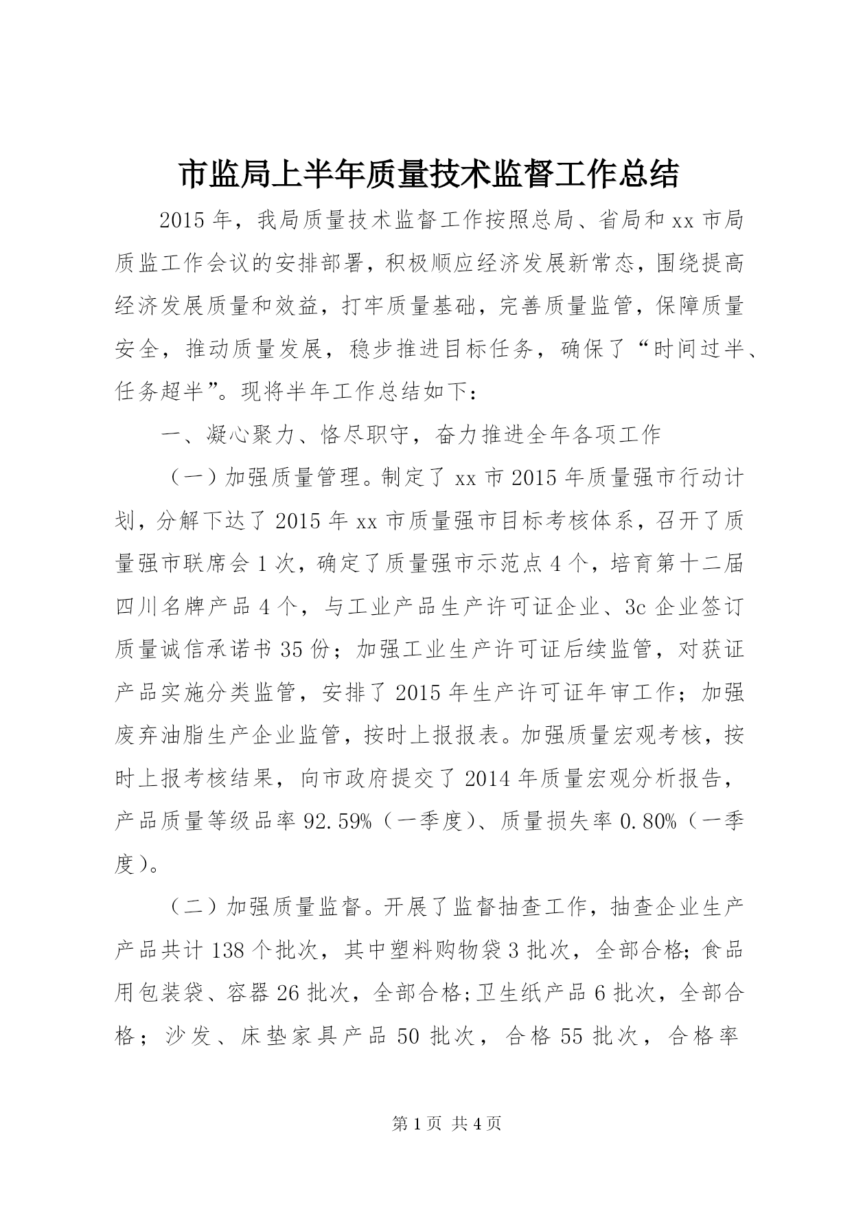 第PAGE\*Arabic\*MERGEFORMAT4页共NUMPAGES\*MERGEFORMAT4页市监局上半年质量技术监督工作总结2015年,我局质量技术监督工作按照总局、省局和xx市局质监工作会议的安排部署,积极顺应经济发展新常态,围绕提高经济发展质量和效益,打牢质量基础,完善质量监管,保障质量安全,推动质量发展,稳步推进目标任务,确保了“时间过半、任务超半”。现将半年工作总结如下:一、凝心聚力、恪尽职守,奋力推进全年各项工作(一)加强质量管理。制定了xx市2015年质量强市行动计划,