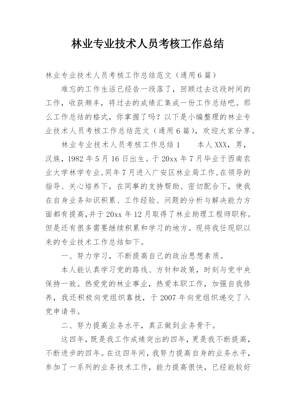 林业专业技术人员考核工作总结林业专业技术人员考核工作总结范文(通用6篇)难忘的工作生活已经告一段落了,回顾过去这段时间的工作,收获颇丰,将过去的成绩汇集成一份工作总结吧。那么工作总结的格式,你掌握了吗?以下是小编整理的林业专业技术人员考核工作总结范文(通用6篇),欢迎大家分享。林业专业技术人员考核工作总结1本人XXX,男,汉族,1982年5月16日出生。于20xx年7月毕业于西南农业大学林学专业,同年7月进入广安区林业局工作,在领导的指导、关心培养下,在同事的支持帮助、密切配合下,使我在自身业务知识积累、