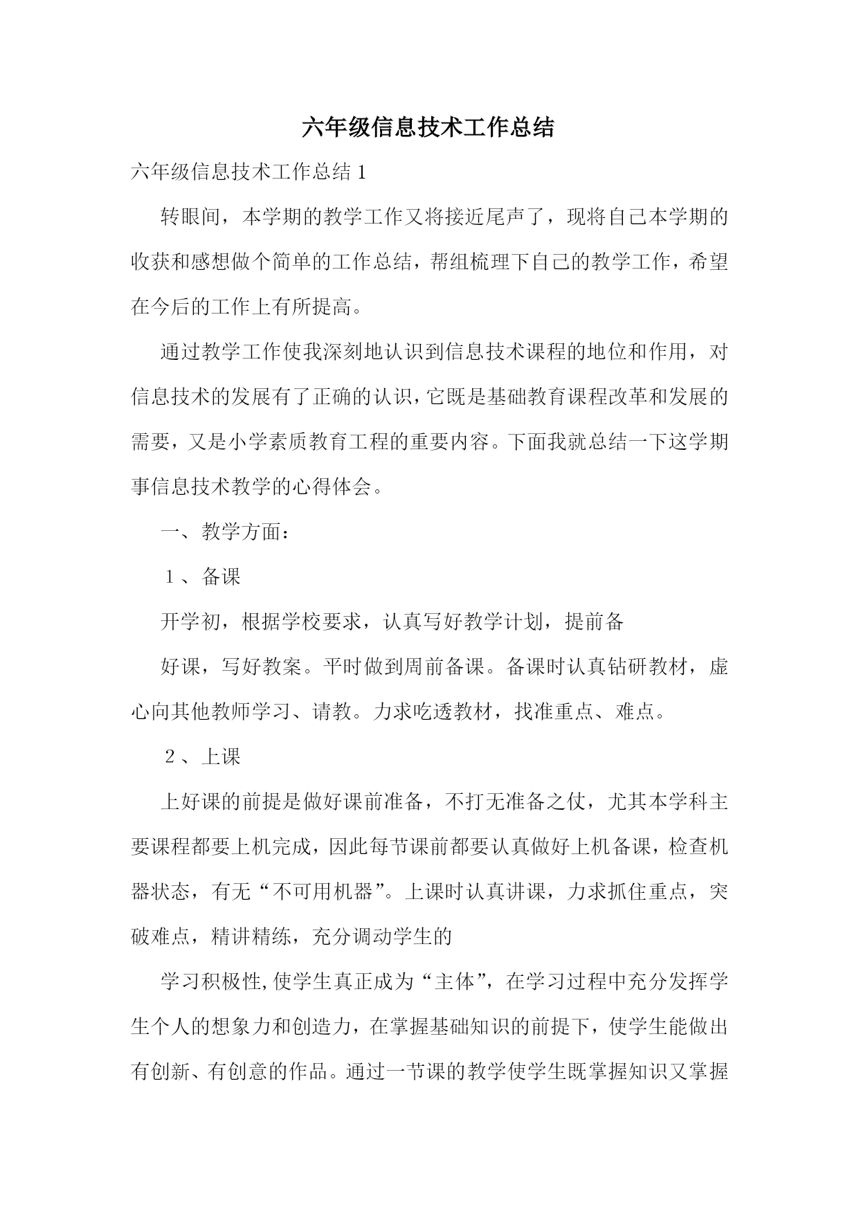 六年级信息技术工作总结六年级信息技术工作总结1转眼间,本学期的教学工作又将接近尾声了,现将自己本学期的收获和感想做个简单的工作总结,帮组梳理下自己的教学工作,希望在今后的工作上有所提高。通过教学工作使我深刻地认识到信息技术课程的地位和作用,对信息技术的发展有了正确的认识,它既是基础教育课程改革和发展的需要,又是小学素质教育工程的重要内容。下面我就总结一下这学期事信息技术教学的心得体会。一、教学方面:1、备课开学初,根据学校要求,认真写好教学计划,提前备好课,写好教案。平时做到周前备课。备课时认真钻研教材,