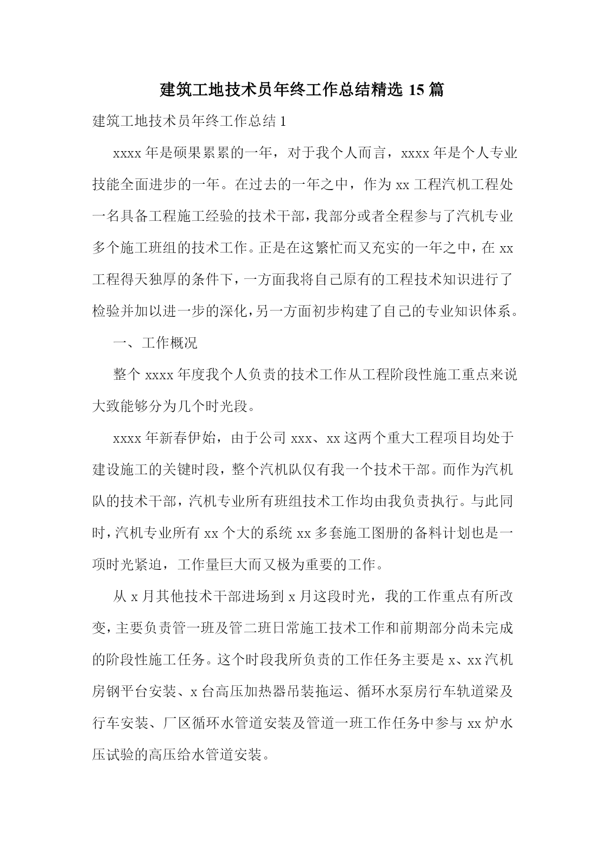 建筑工地技术员年终工作总结精选15篇建筑工地技术员年终工作总结1xxxx年是硕果累累的一年,对于我个人而言,xxxx年是个人专业技能全面进步的一年。在过去的一年之中,作为xx工程汽机工程处一名具备工程施工经验的技术干部,我部分或者全程参与了汽机专业多个施工班组的技术工作。正是在这繁忙而又充实的一年之中,在xx工程得天独厚的条件下,一方面我将自己原有的工程技术知识进行了检验并加以进一步的深化,另一方面初步构建了自己的专业知识体系。一、工作概况整个xxxx年度我个人负责的技术工作从工程阶段性施工重点来说大致能