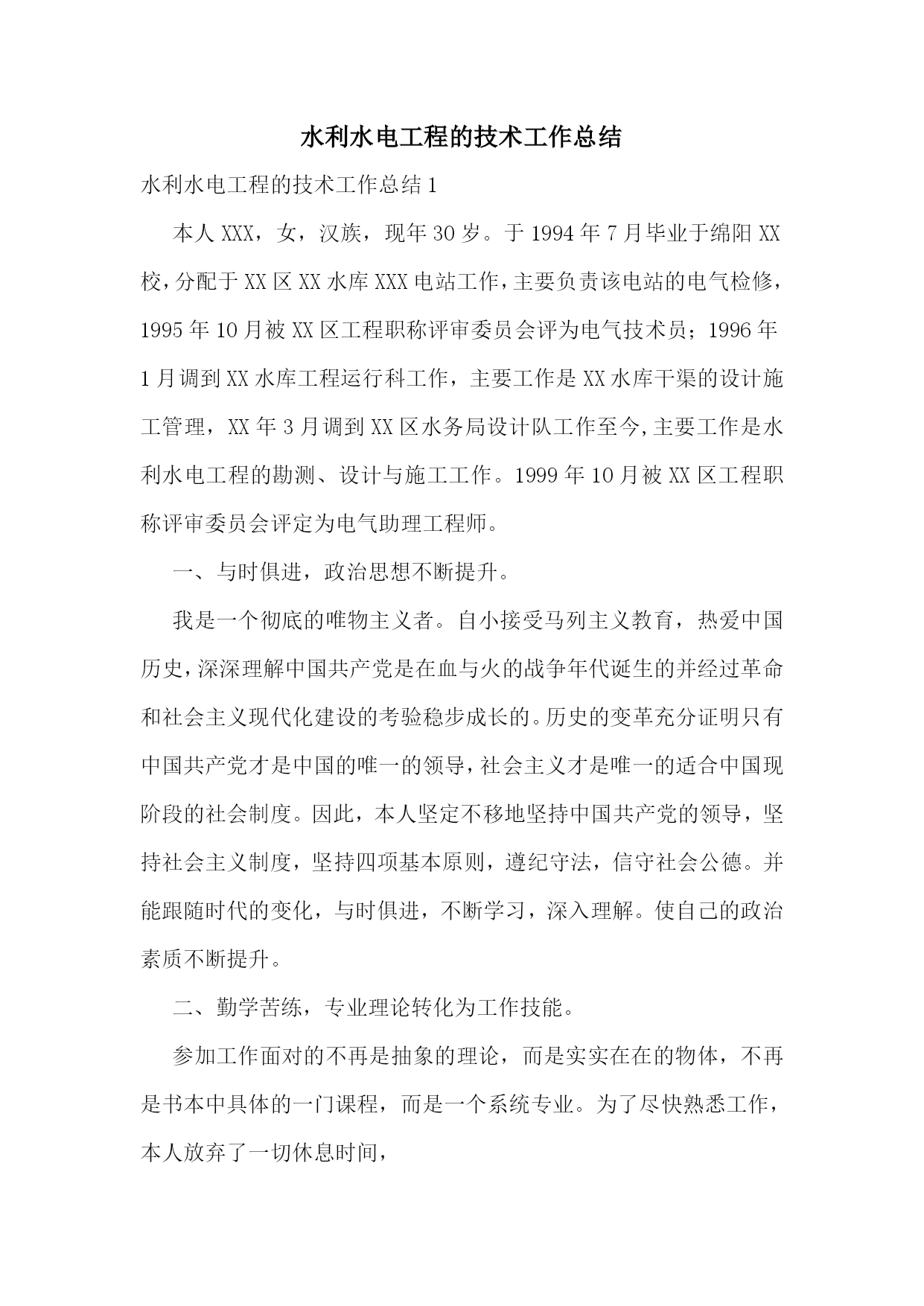 水利水电工程的技术工作总结水利水电工程的技术工作总结1本人XXX,女,汉族,现年30岁。于1994年7月毕业于绵阳XX校,分配于XX区XX水库XXX电站工作,主要负责该电站的电气检修,1995年10月被XX区工程职称评审委员会评为电气技术员;1996年1月调到XX水库工程运行科工作,主要工作是XX水库干渠的设计施工管理,XX年3月调到XX区水务局设计队工作至今,主要工作是水利水电工程的勘测、设计与施工工作。1999年10月被XX区工程职称评审委员会评定为电气助理工程师。一、与时俱进,政治思想不断提升。我是