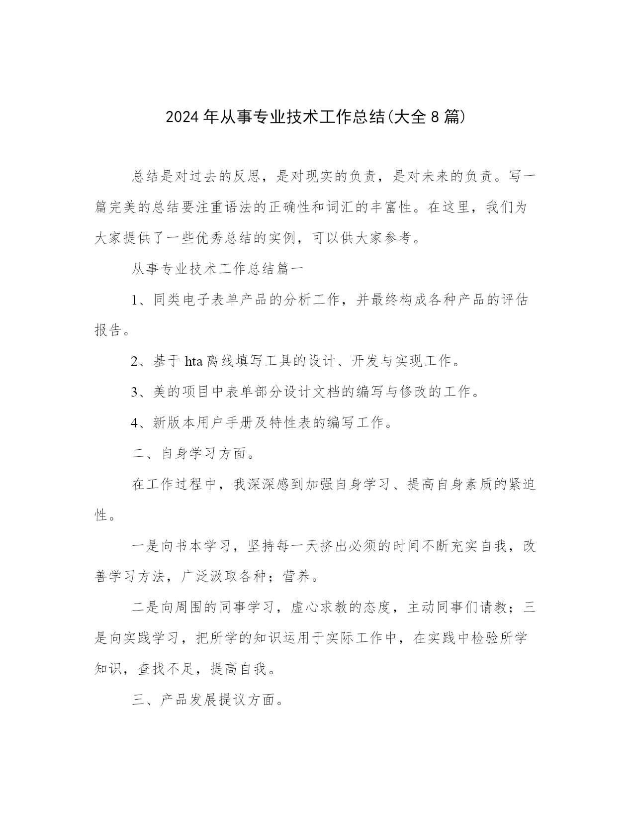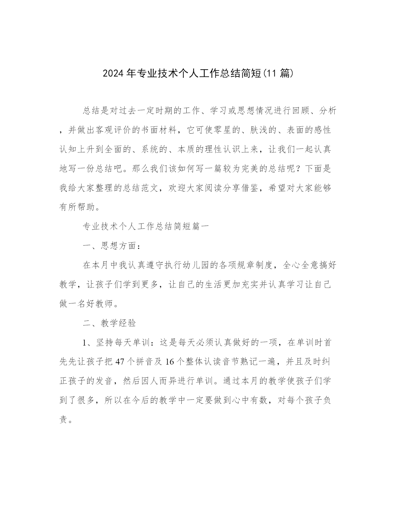 2024年专业技术个人工作总结简短(11篇)总结是对过去一定时期的工作、学习或思想情况进行回顾、分析,并做出客观评价的书面材料,它可使零星的、肤浅的、表面的感性认知上升到全面的、系统的、本质的理性认识上来,让我们一起认真地写一份总结吧。那么我们该如何写一篇较为完美的总结呢?下面是我给大家整理的总结范文,欢迎大家阅读分享借鉴,希望对大家能够有所帮助。专业技术个人工作总结简短篇一一、思想方面:在本月中我认真遵守执行幼儿园的各项规章制度,全心全意搞好教学,让孩子们学到更多,让自己的生活更加充实并认真学习让自己做