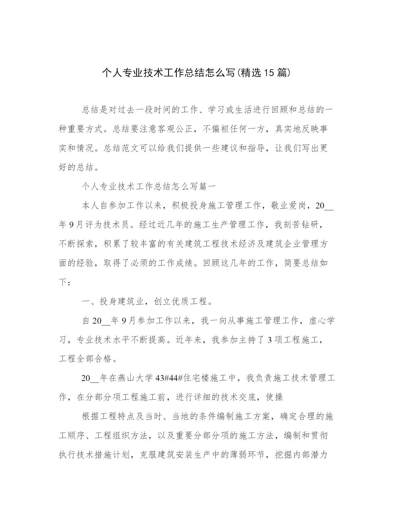 个人专业技术工作总结怎么写(精选15篇)总结是对过去一段时间的工作、学习或生活进行回顾和总结的一种重要方式。总结要注意客观公正,不偏袒任何一方,真实地反映事实和情况。总结范文可以给我们提供一些建议和指导,让我们写出更好的总结。个人专业技术工作总结怎么写篇一本人自参加工作以来,积极投身施工管理工作,敬业爱岗,20__年9月评为技术员。经过近几年的施工生产管理工作,我刻苦钻研,不断探索,积累了较丰富的有关建筑工程技术经济及建筑企业管理方面的经验,取得了必须的工作成绩。回顾这几年的工作,简要总结如下:一、投身建
