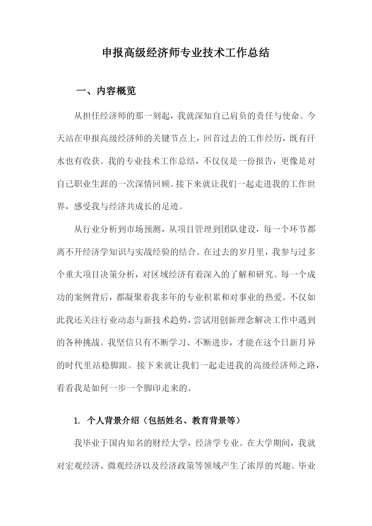 申报高级经济师专业技术工作总结一、内容概览从担任经济师的那一刻起,我就深知自己肩负的责任与使命。今天站在申报高级经济师的关键节点上,回首过去的工作经历,既有汗水也有收获。我的专业技术工作总结,不仅仅是一份报告,更像是对自己职业生涯的一次深情回顾。接下来就让我们一起走进我的工作世界,感受我与经济共成长的足迹。从行业分析到市场预测,从项目管理到团队建设,每一个环节都离不开经济学知识与实战经验的结合。在过去的岁月里,我参与过多个重大项目决策分析,对区域经济有着深入的了解和研究。每一个成功的案例背后,都凝聚着我多