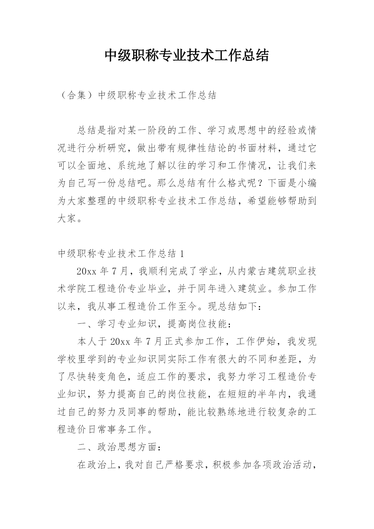 中级职称专业技术工作总结(合集)中级职称专业技术工作总结总结是指对某一阶段的工作、学习或思想中的经验或情况进行分析研究,做出带有规律性结论的书面材料,通过它可以全面地、系统地了解以往的学习和工作情况,让我们来为自己写一份总结吧。那么总结有什么格式呢?下面是小编为大家整理的中级职称专业技术工作总结,希望能够帮助到大家。中级职称专业技术工作总结120xx年7月,我顺利完成了学业,从内蒙古建筑职业技术学院工程造价专业毕业,并于同年进入建筑业。参加工作以来,我从事工程造价工作至今。现总结如下:一、学习专业知识,提