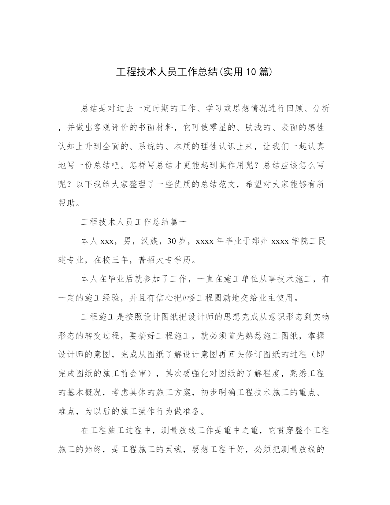 工程技术人员工作总结(实用10篇)总结是对过去一定时期的工作、学习或思想情况进行回顾、分析,并做出客观评价的书面材料,它可使零星的、肤浅的、表面的感性认知上升到全面的、系统的、本质的理性认识上来,让我们一起认真地写一份总结吧。怎样写总结才更能起到其作用呢?总结应该怎么写呢?以下我给大家整理了一些优质的总结范文,希望对大家能够有所帮助。工程技术人员工作总结篇一本人xxx,男,汉族,30岁,xxxx年毕业于郑州xxxx学院工民建专业,在校三年,普招大专学历。本人在毕业后就参加了工作,一直在施工单位从事技术施工