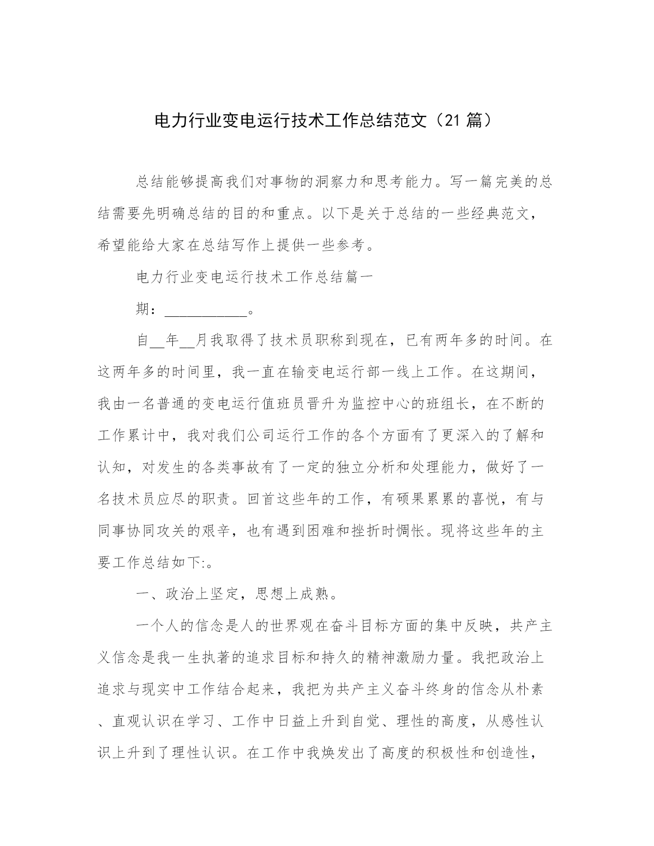 电力行业变电运行技术工作总结范文(21篇)总结能够提高我们对事物的洞察力和思考能力。写一篇完美的总结需要先明确总结的目的和重点。以下是关于总结的一些经典范文,希望能给大家在总结写作上提供一些参考。电力行业变电运行技术工作总结篇一期:___________。自__年__月我取得了技术员职称到现在,已有两年多的时间。在这两年多的时间里,我一直在输变电运行部一线上工作。在这期间,我由一名普通的变电运行值班员晋升为监控中心的班组长,在不断的工作累计中,我对我们公司运行工作的各个方面有了更深入的了解和认知,对发生的