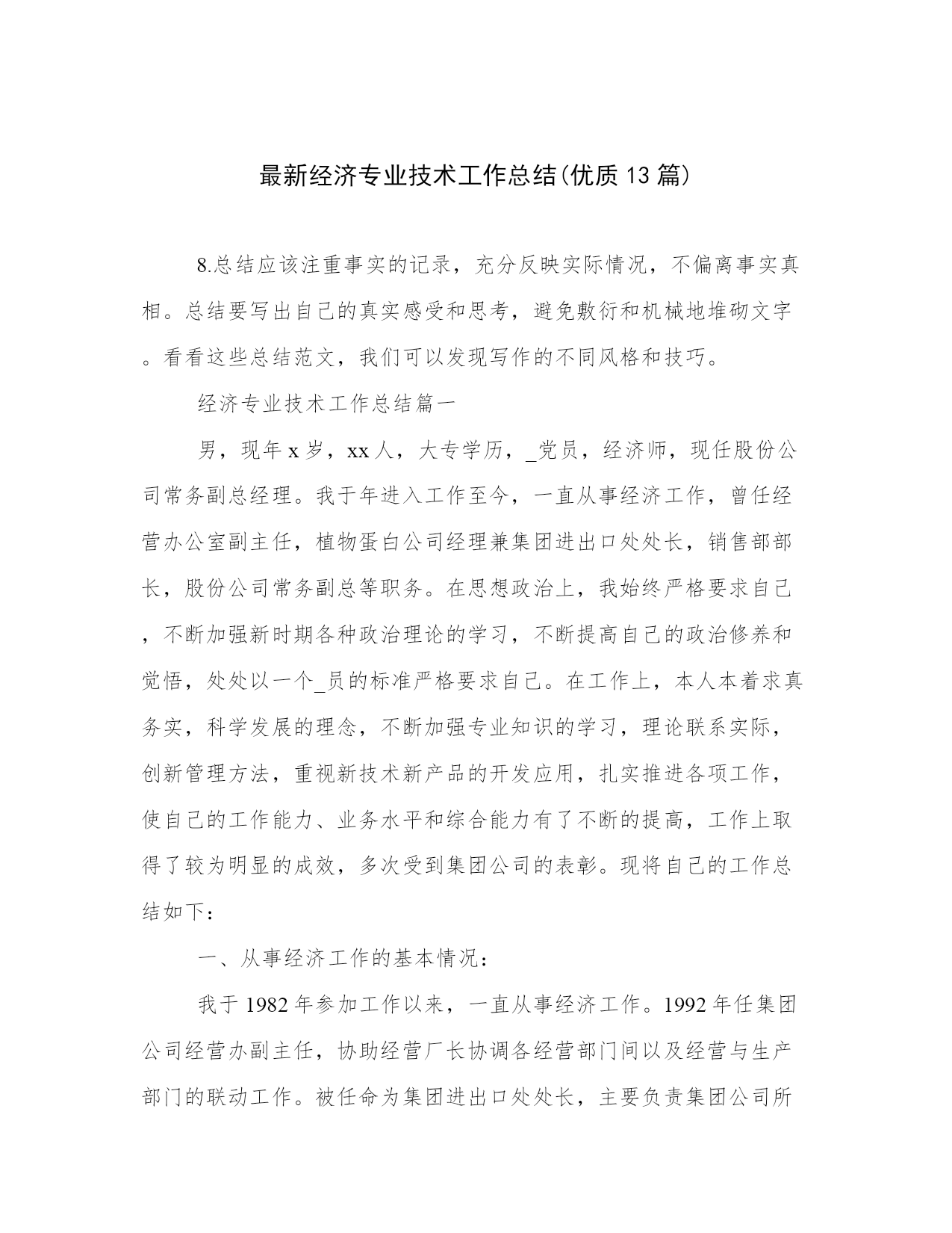最新经济专业技术工作总结(优质13篇)8.总结应该注重事实的记录,充分反映实际情况,不偏离事实真相。总结要写出自己的真实感受和思考,避免敷衍和机械地堆砌文字。看看这些总结范文,我们可以发现写作的不同风格和技巧。经济专业技术工作总结篇一男,现年x岁,xx人,大专学历,_党员,经济师,现任股份公司常务副总经理。我于年进入工作至今,一直从事经济工作,曾任经营办公室副主任,植物蛋白公司经理兼集团进出口处处长,销售部部长,股份公司常务副总等职务。在思想政治上,我始终严格要求自己,不断加强新时期各种政治理论的学习,不