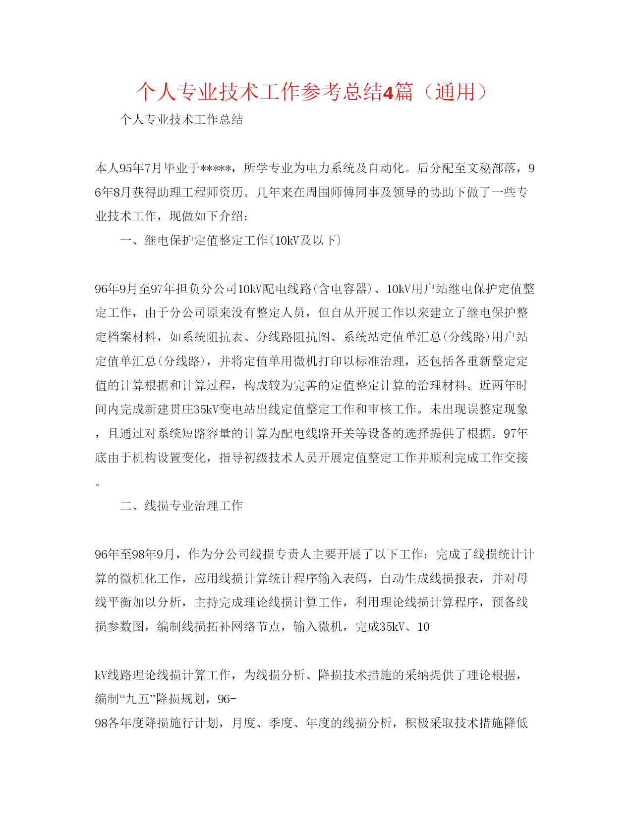 个人专业技术工作参考总结4篇(通用)个人专业技术工作总结本人95年7月毕业于*****,所学专业为电力系统及自动化。后分配至文秘部落,96年8月获得助理工程师资历。几年来在周围师傅同事及领导的协助下做了一些专业技术工作,现做如下介绍:一、继电保护定值整定工作(10kV及以下)96年9月至97年担负分公司10kV配电线路(含电容器)、10kV用户站继电保护定值整定工作,由于分公司原来没有整定人员,但自从开展工作以来建立了继电保护整定档案材料,如系统阻抗表、分线路阻抗图、系统站定值单汇总(分线路)用户站定值单