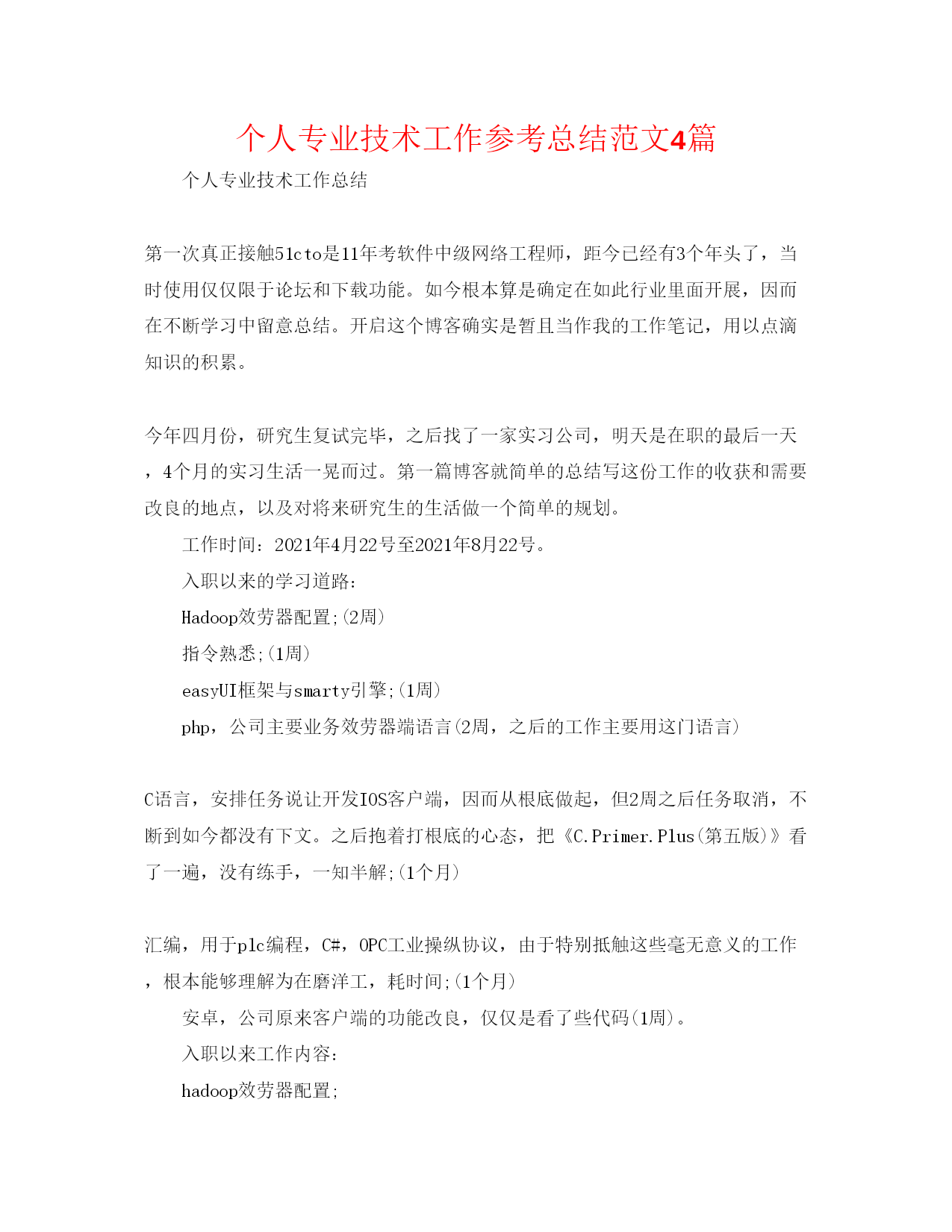 个人专业技术工作参考总结范文4篇个人专业技术工作总结第一次真正接触51cto是11年考软件中级网络工程师,距今已经有3个年头了,当时使用仅仅限于论坛和下载功能。如今根本算是确定在如此行业里面开展,因而在不断学习中留意总结。开启这个博客确实是暂且当作我的工作笔记,用以点滴知识的积累。今年四月份,研究生复试完毕,之后找了一家实习公司,明天是在职的最后一天,4个月的实习生活一晃而过。第一篇博客就简单的总结写这份工作的收获和需要改良的地点,以及对将来研究生的生活做一个简单的规划。工作时间:2021年4月22号至2