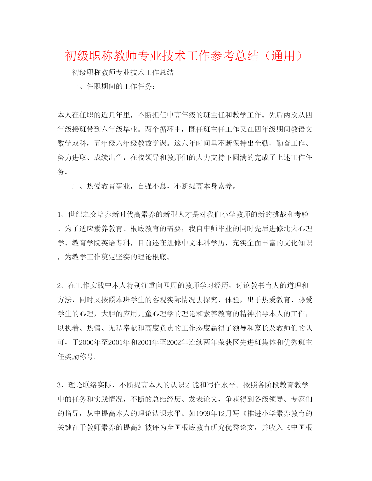 初级职称教师专业技术工作参考总结(通用)初级职称教师专业技术工作总结一、任职期间的工作任务:本人在任职的近几年里,不断担任中高年级的班主任和教学工作。先后两次从四年级接班带到六年级毕业。两个循环中,既任班主任工作又在四年级期间教语文数学双科,五年级六年级教数学课。这六年时间里不断保持出全勤、勤奋工作、努力进取、成绩出色,在校领导和教师们的大力支持下圆满的完成了上述工作任务。二、热爱教育事业,自强不息,不断提高本身素养。1、世纪之交培养新时代高素养的新型人才是对我们小学教师的新的挑战和考验。为了适应素养教育