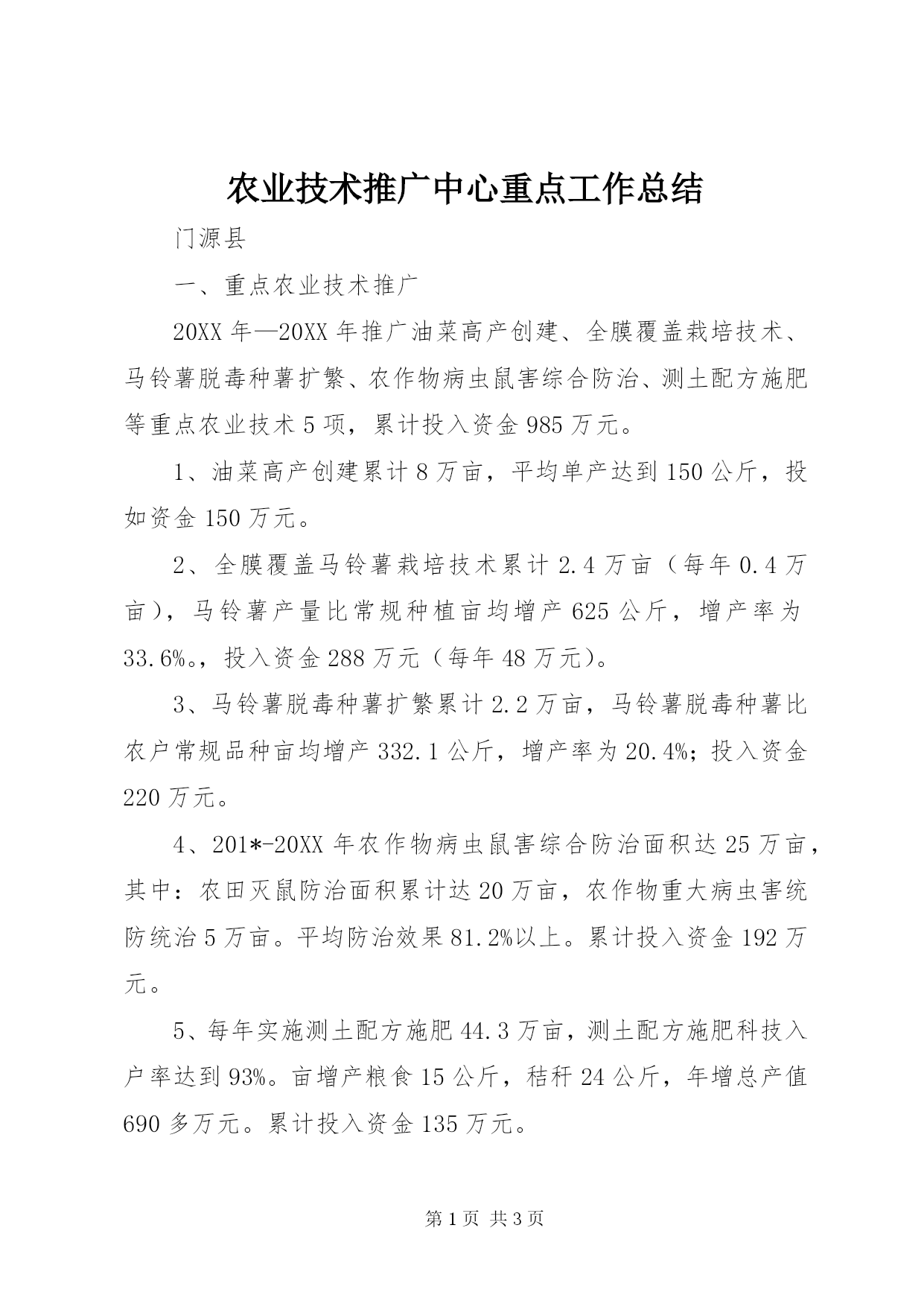 第PAGE\*Arabic\*MERGEFORMAT3页共NUMPAGES\*MERGEFORMAT3页农业技术推广中心重点工作总结门源县一、重点农业技术推广20XX年—20XX年推广油菜高产创建、全膜覆盖栽培技术、马铃薯脱毒种薯扩繁、农作物病虫鼠害综合防治、测土配方施肥等重点农业技术5项,累计投入资金985万元。1、油菜高产创建累计8万亩,平均单产达到150公斤,投如资金150万元。2、全膜覆盖马铃薯栽培技术累计2.4万亩(每年0.4万亩),马铃薯产量比常规种植亩均增产625公斤,增产率为3