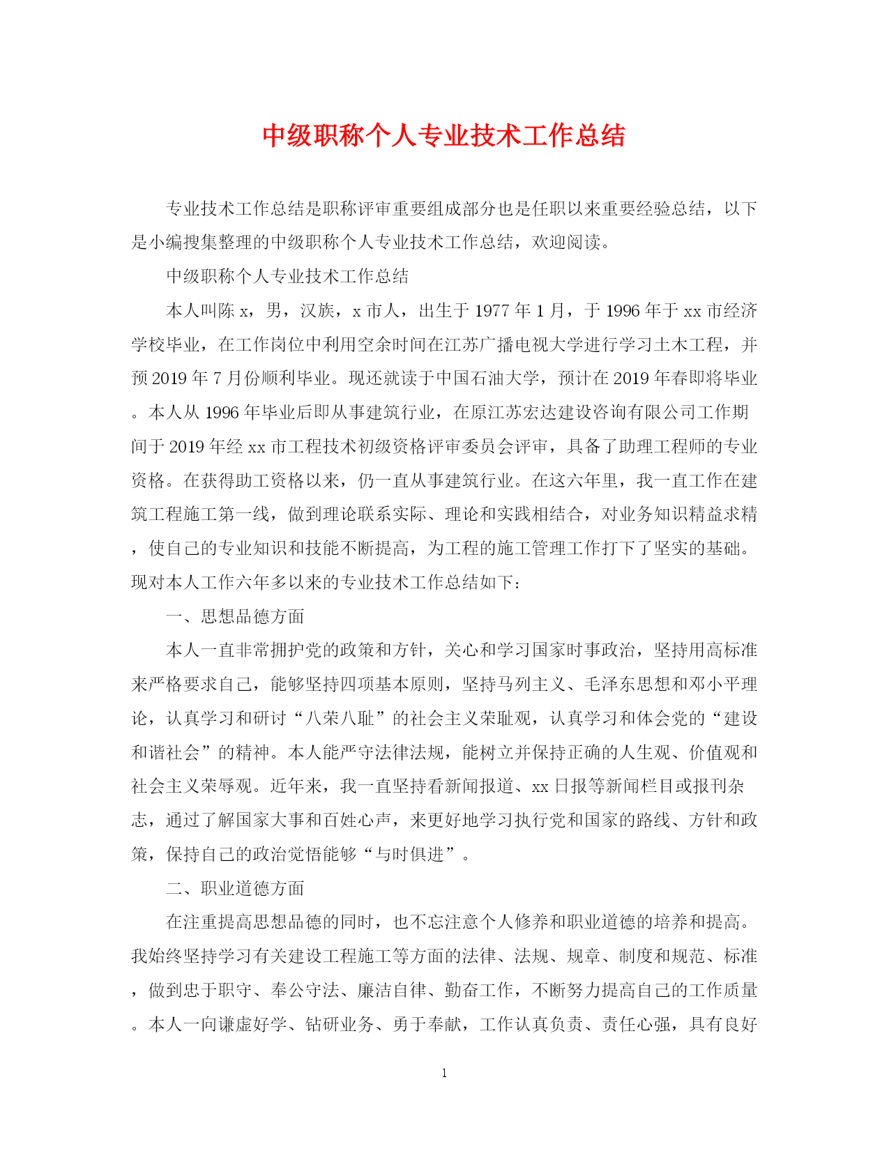 此资料由网络收集而来,如有侵权请告知上传者立即删除。资料共分享,我们负责传递知识。PAGEPAGE6中级职称个人专业技术工作总结专业技术工作总结是职称评审重要组成部分也是任职以来重要经验总结,以下是小编搜集整理的中级职称个人专业技术工作总结,欢迎阅读。中级职称个人专业技术工作总结本人叫陈x,男,汉族,x市人,出生于1977年1月,于1996年于xx市经济学校毕业,在工作岗位中利用空余时间在江苏广播电视大学进行学习土木工程,并预2019年7月份顺利毕业。现还就读于中国石油大学,预计在2019年春