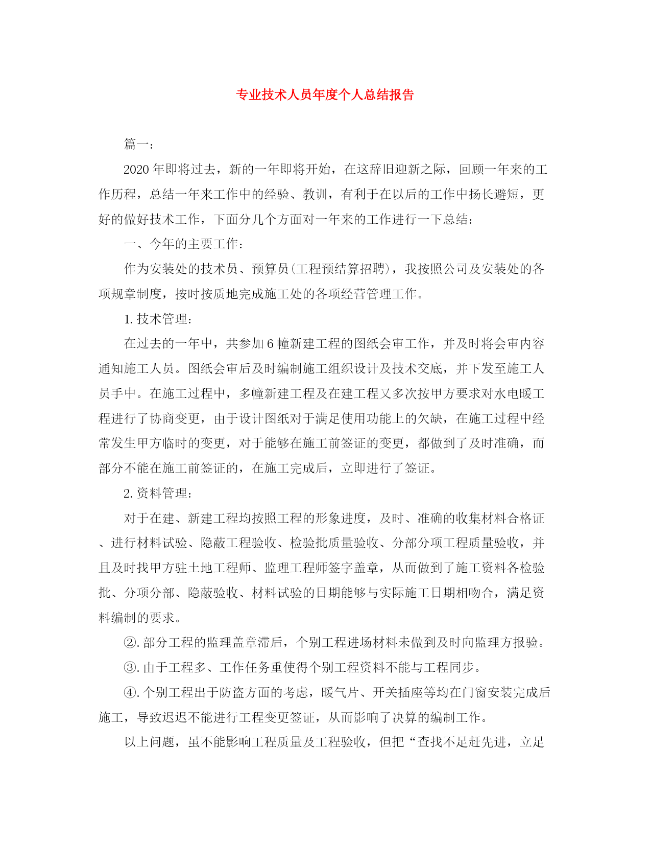 此资料由网络收集而来,如有侵权请告知上传者立即删除。资料共分享,我们负责传递知识。专业技术人员年度个人总结报告篇一:2020年即将过去,新的一年即将开始,在这辞旧迎新之际,回顾一年来的工作历程,总结一年来工作中的经验、教训,有利于在以后的工作中扬长避短,更好的做好技术工作,下面分几个方面对一年来的工作进行一下总结:一、今年的主要工作:作为安装处的技术员、预算员(工程预结算招聘),我按照公司及安装处的各项规章制度,按时按质地完成施工处的各项经营管理工作。1.技术管理:在过去的一年中,共参加6幢新建工程的图纸