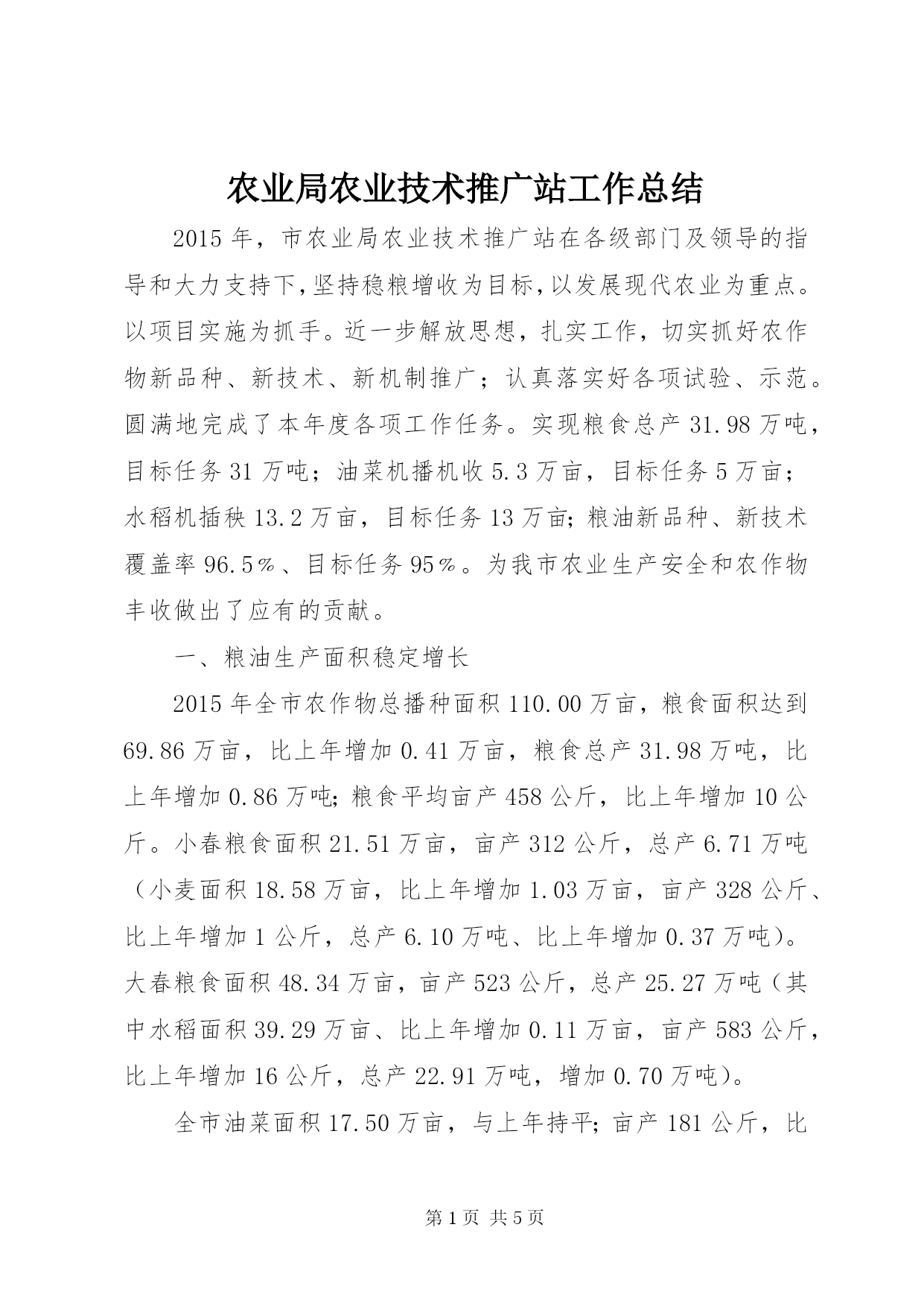 第PAGE\*Arabic\*MERGEFORMAT5页共NUMPAGES\*MERGEFORMAT5页农业局农业技术推广站工作总结2015年,市农业局农业技术推广站在各级部门及领导的指导和大力支持下,坚持稳粮增收为目标,以发展现代农业为重点。以项目实施为抓手。近一步解放思想,扎实工作,切实抓好农作物新品种、新技术、新机制推广;认真落实好各项试验、示范。圆满地完成了本年度各项工作任务。实现粮食总产31.98万吨,目标任务31万吨;油菜机播机收5.3万亩,目标任务5万亩;水稻机插秧13.2万亩,