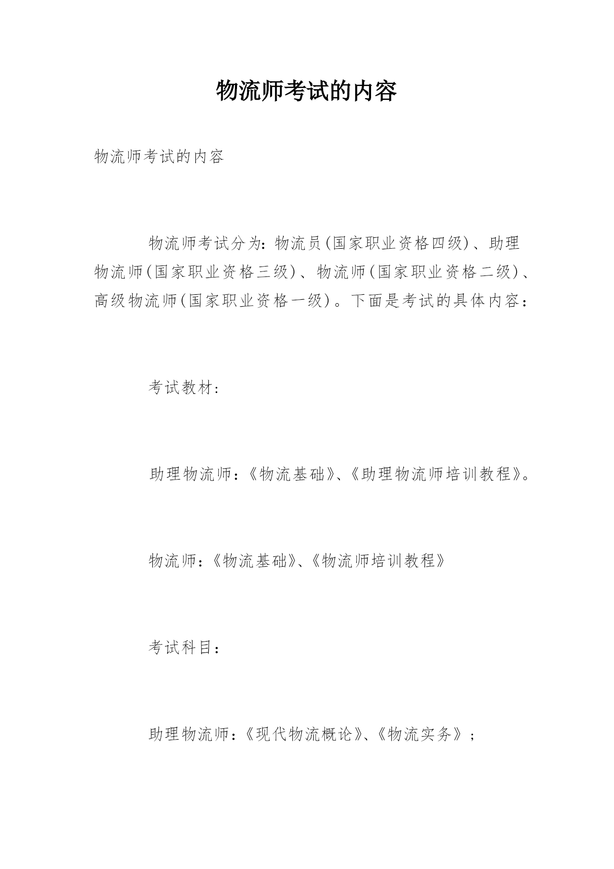 物流师考试的内容物流师考试的内容物流师考试分为:物流员(国家职业资格四级)、助理物流师(国家职业资格三级)、物流师(国家职业资格二级)、高级物流师(国家职业资格一级)。下面是考试的具体内容:考试教材:助理物流师:《物流基础》、《助理物流师培训教程》。物流师:《物流基础》、《物流师培训教程》考试科目:助理物流师:《现代物流概论》、《物流实务》;物流师:《现代物流概论》、《物流管理》;高级物流师:《现代物流概论》、《物流系统工程》。学习内容:理论知识部分:物流概述、物流运行系统、物流管理系统、物流装备与标准化