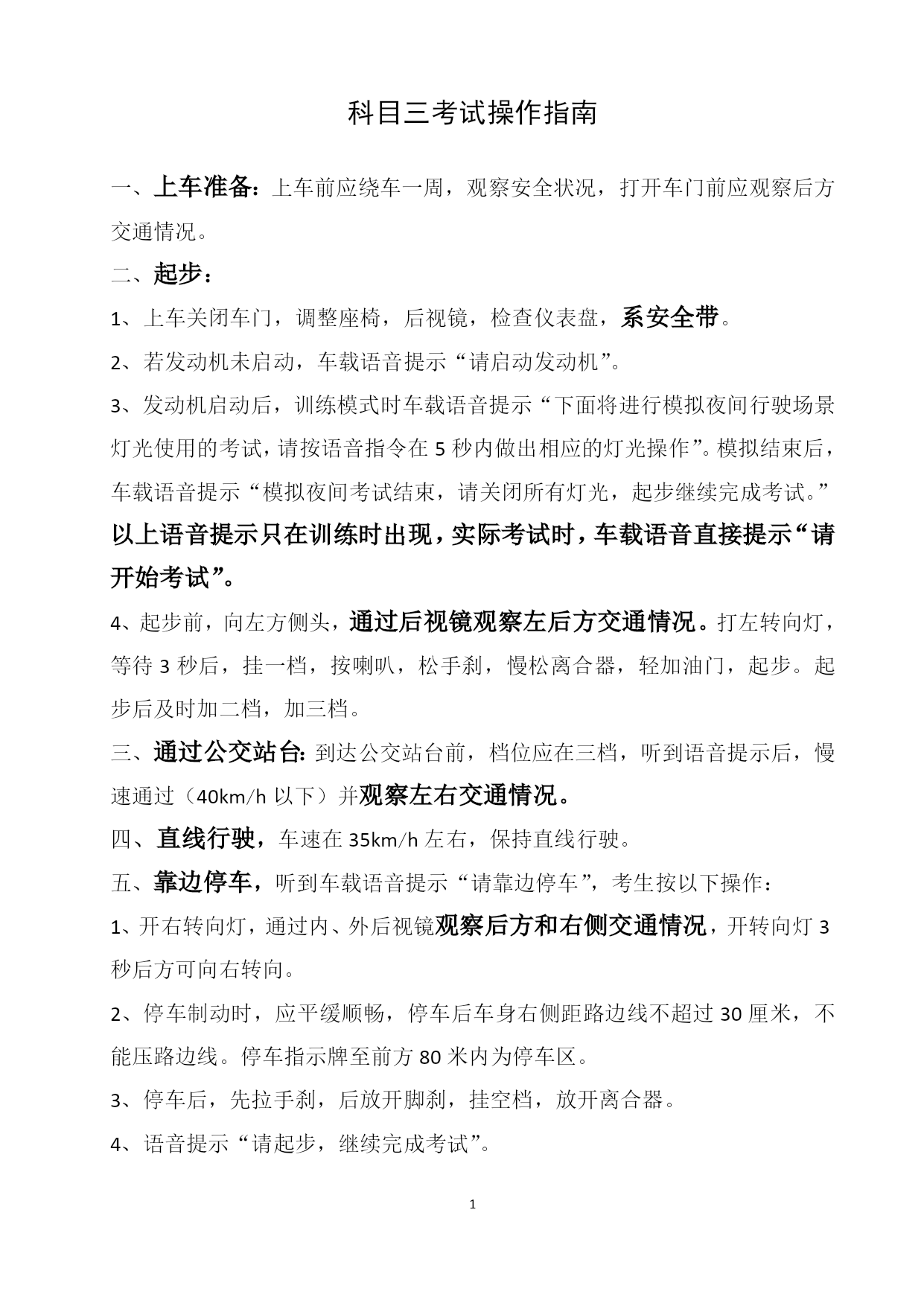 PAGE\*MERGEFORMAT2科目三考试操作指南一、上车准备:上车前应绕车一周,观察安全状况,打开车门前应观察后方交通情况。二、起步:1、上车关闭车门,调整座椅,后视镜,检查仪表盘,系安全带。2、若发动机未启动,车载语音提示“请启动发动机”。3、发动机启动后,训练模式时车载语音提示“下面将进行模拟夜间行驶场景灯光使用的考试,请按语音指令在5秒内做出相应的灯光操作”。模拟结束后,车载语音提示“模拟夜间考试结束,请关闭所有灯光,起步继续完成考试。”以上语音提示只在训练时出现,实际考试时,车载语音直