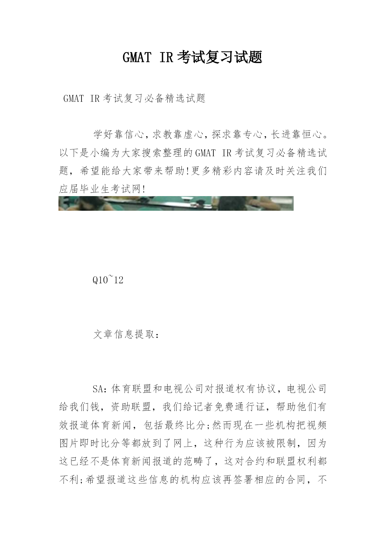 GMATIR考试复习试题GMATIR考试复习必备精选试题学好靠信心,求教靠虚心,探求靠专心,长进靠恒心。以下是小编为大家搜索整理的GMATIR考试复习必备精选试题,希望能给大家带来帮助!更多精彩内容请及时关注我们应届毕业生考试网!Q10~12文章信息提取:SA:体育联盟和电视公司对报道权有协议,电视公司给我们钱,资助联盟,我们给记者免费通行证,帮助他们有效报道体育新闻,包括最终比分;然而现在一些机构把视频图片即时比分等都放到了网上,这种行为应该被限制,因为这已经不是体育新闻报道的范畴了,这对合约和联盟权利