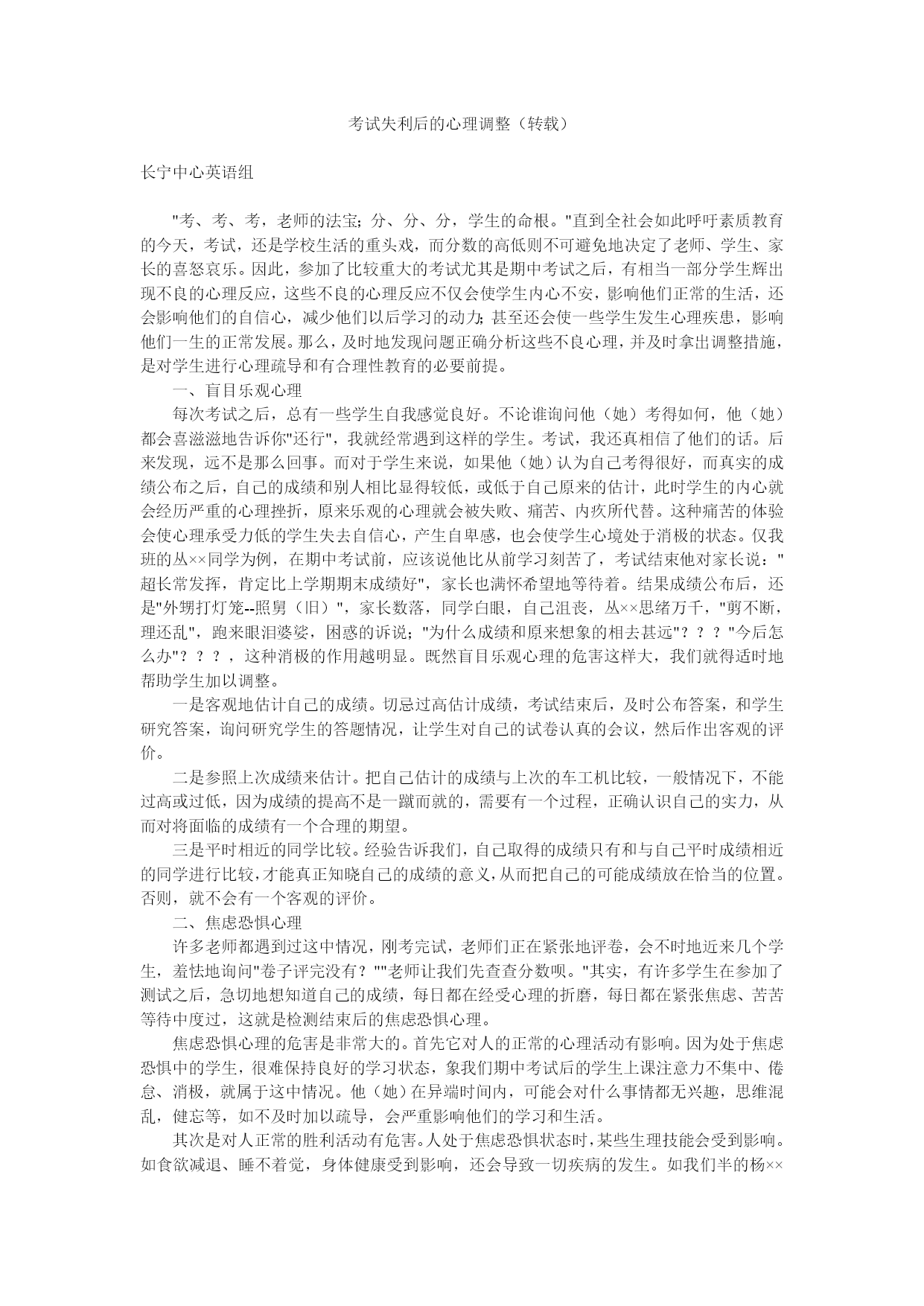 考试失利后的心理调整(转载)长宁中心英语组"考、考、考,老师的法宝;分、分、分,学生的命根。"直到全社会如此呼吁素质教育的今天,考试,还是学校生活的重头戏,而分数的高低则不可避免地决定了老师、学生、家长的喜怒哀乐。因此,参加了比较重大的考试尤其是期中考试之后,有相当一部分学生辉出现不良的心理反应,这些不良的心理反应不仅会使学生内心不安,影响他们正常的生活,还会影响他们的自信心,减少他们以后学习的动力;甚至还会使一些学生发生心理疾患,影响他们一生的正常发展。那么,及时地发现问题正确分析这些不良心理,并及时拿