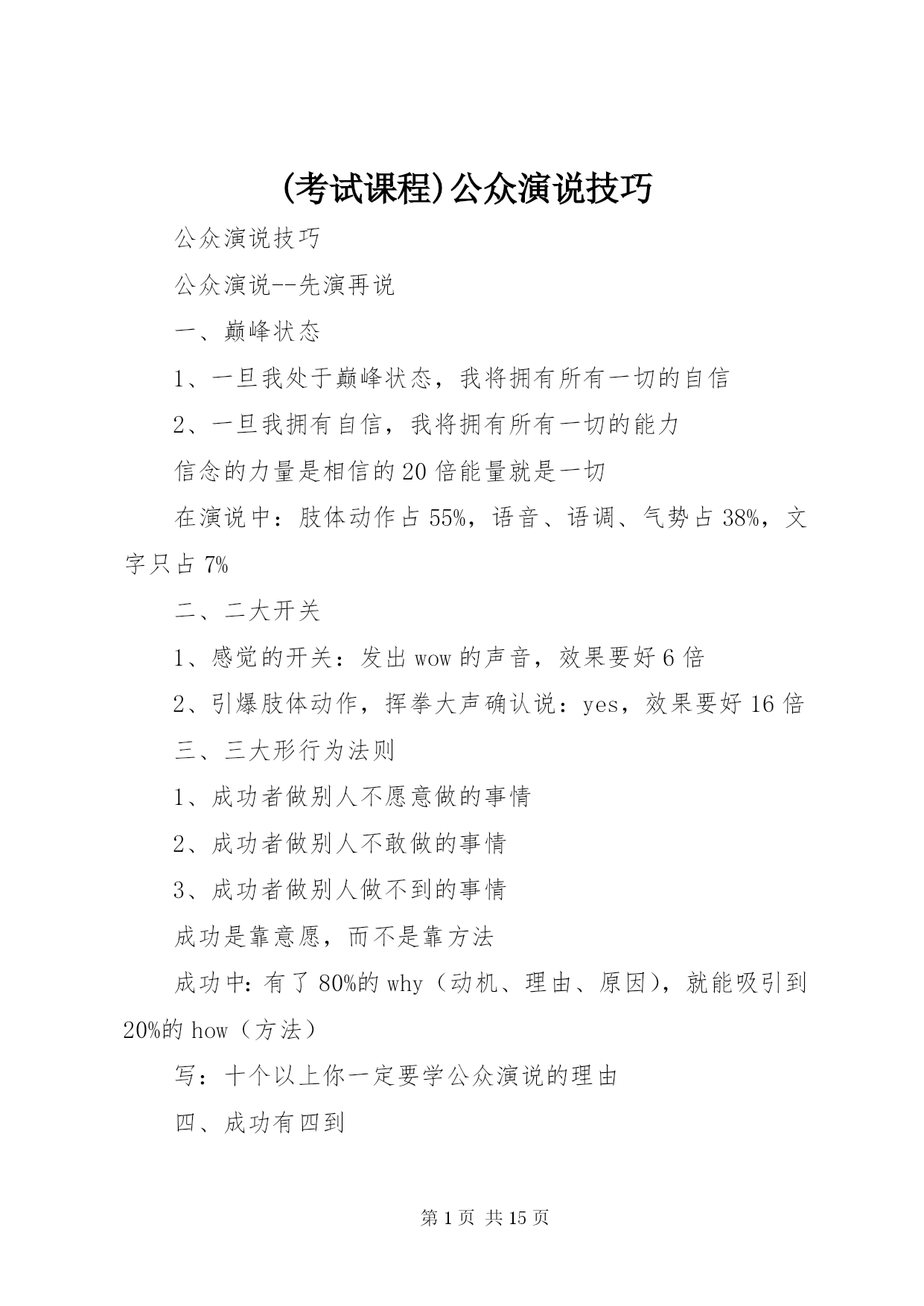 第PAGE\*Arabic\*MERGEFORMAT15页共NUMPAGES\*MERGEFORMAT15页(考试课程)公众演说技巧公众演说技巧公众演说--先演再说一、巅峰状态1、一旦我处于巅峰状态,我将拥有所有一切的自信2、一旦我拥有自信,我将拥有所有一切的能力信念的力量是相信的20倍能量就是一切在演说中:肢体动作占55%,语音、语调、气势占38%,文字只占7%二、二大开关1、感觉的开关:发出wow的声音,效果要好6倍2、引爆肢体动作,挥拳大声确认说:yes,效果要好16倍三、三大形行为法则