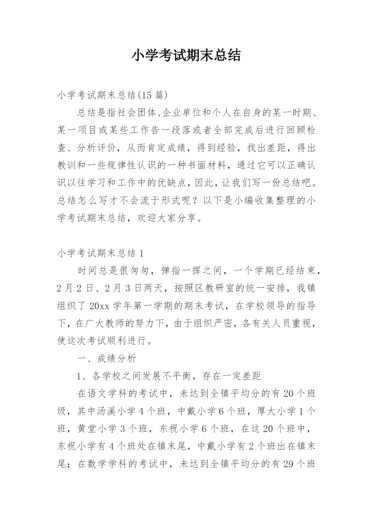 小学考试期末总结小学考试期末总结(15篇)总结是指社会团体、企业单位和个人在自身的某一时期、某一项目或某些工作告一段落或者全部完成后进行回顾检查、分析评价,从而肯定成绩,得到经验,找出差距,得出教训和一些规律性认识的一种书面材料,通过它可以正确认识以往学习和工作中的优缺点,因此,让我们写一份总结吧。总结怎么写才不会流于形式呢?以下是小编收集整理的小学考试期末总结,欢迎大家分享。小学考试期末总结1时间总是很匆匆,弹指一挥之间,一个学期已经结束,2月2日、2月3日两天,按照区教研室的统一安排,我镇组织了20x