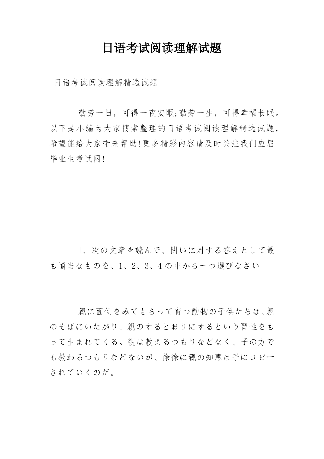 日语考试阅读理解试题日语考试阅读理解精选试题勤劳一日,可得一夜安眠;勤劳一生,可得幸福长眠。以下是小编为大家搜索整理的日语考试阅读理解精选试题,希望能给大家带来帮助!更多精彩内容请及时关注我们应届毕业生考试网!1、次の文章を読んで、問いに対する答えとして最も適当なものを、1、2、3、4の中から一つ選びなさい親に面倒をみてもらって育つ動物の子供たちは、親のそばにいたがり、親のするとおりにするという習性をもって生まれてくる。親は教えるつもりなどなく、子の方でも教わるつもりなどないが、徐徐に親の知恵は子にコピー