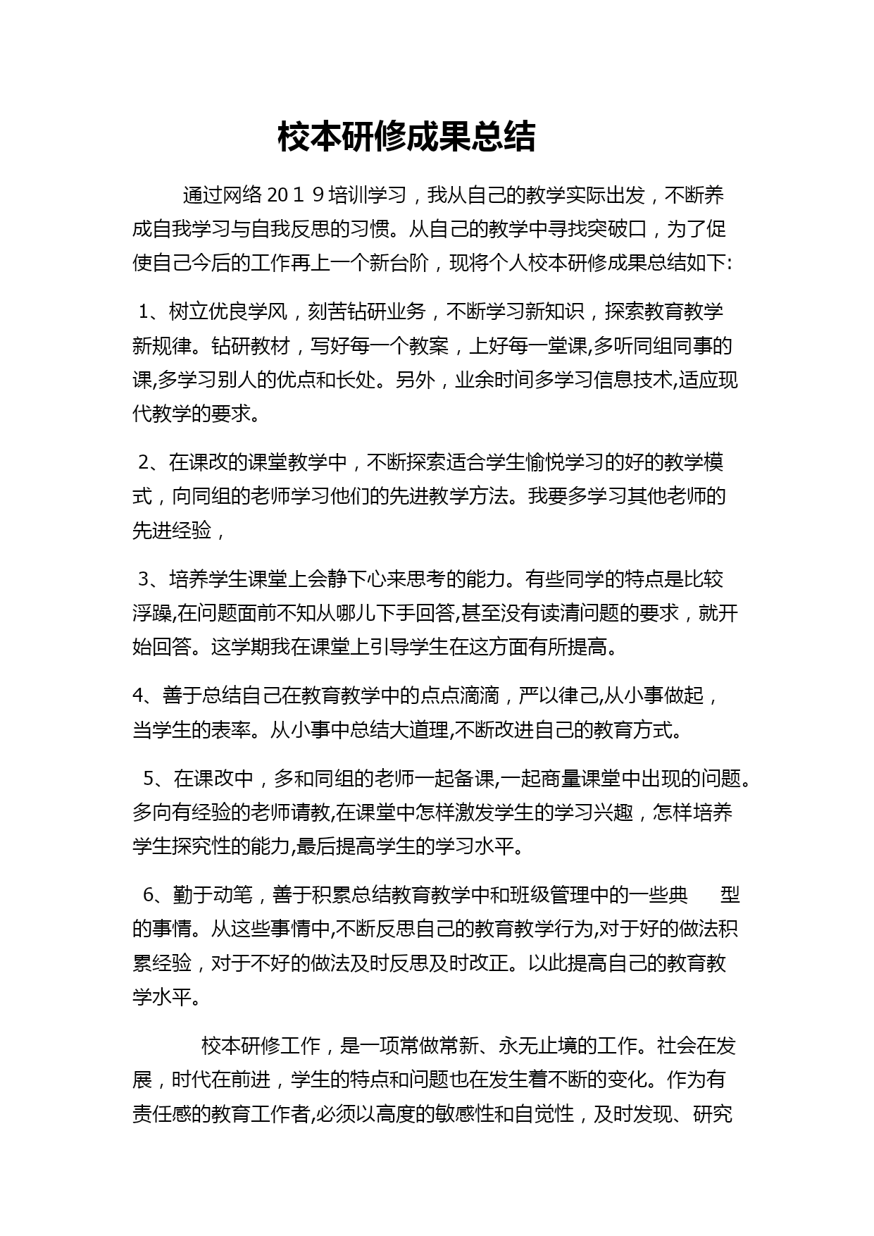 校本研修成果总结 通过网络2019培训学习,我从自己的教学实际出发,不断养成自我学习与自我反思的习惯。从自己的教学中寻找突破口,为了促使自己今后的工作再上一个新台阶,现将个人校本研修成果总结如下: 1、树立优良学风,刻苦钻研业务,不断学习新知识,探索教育教学新规律。钻研教材,写好每一个教案,上好每一堂课,多听同组同事的课,多学习别人的优点和长处。另外,业余时间多学习信息技术,适应现代教学的要求。2、在课改的课堂教学中,不断探索适合学生愉悦学习的好的教学模式,向同组的老师学习他们的先进教学方法。我要多学习其